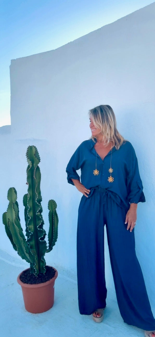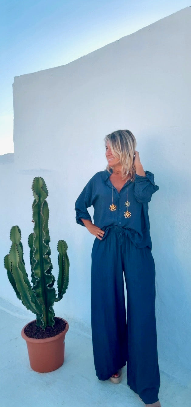 Pantalón ancho. Tiro alto con cintura de goma elástica. Bolsillos diagonales.