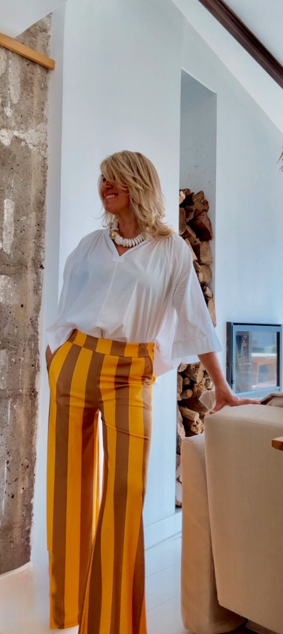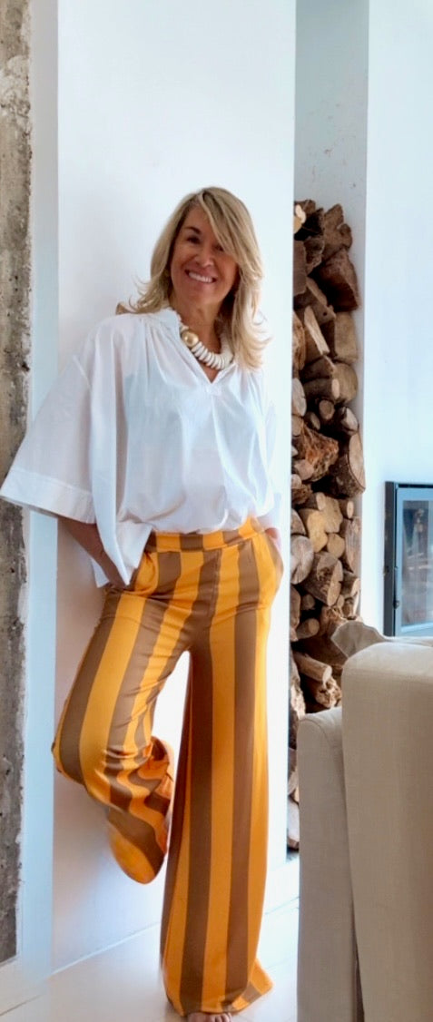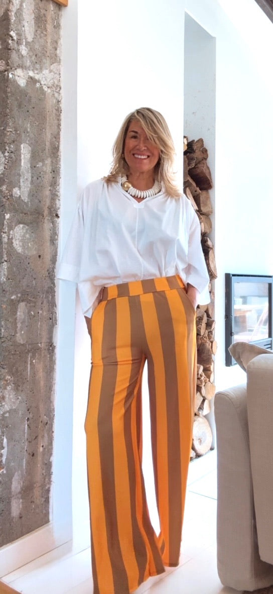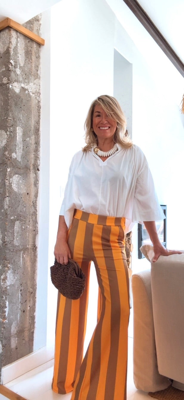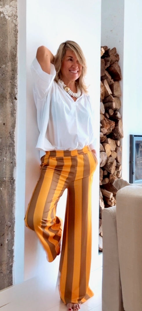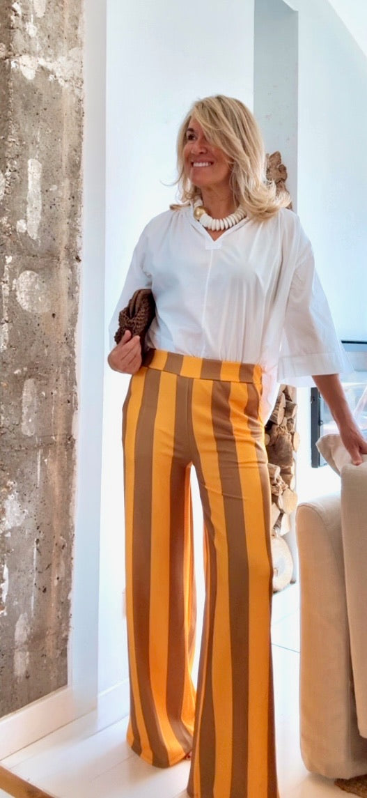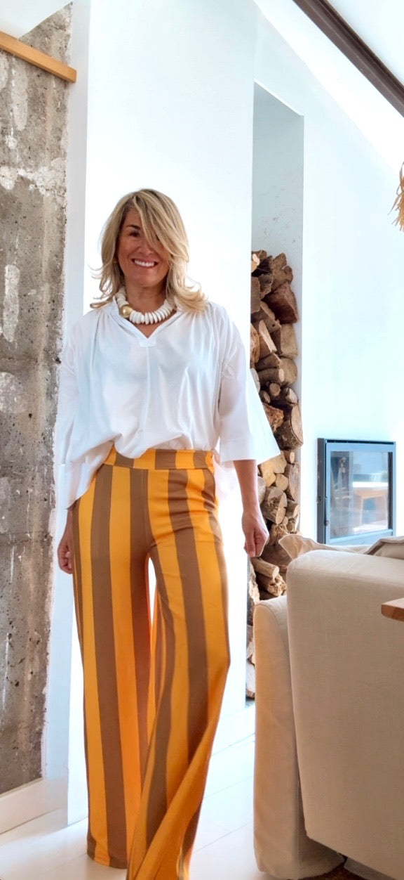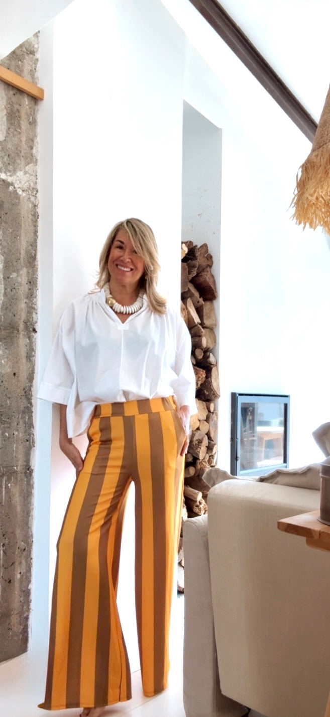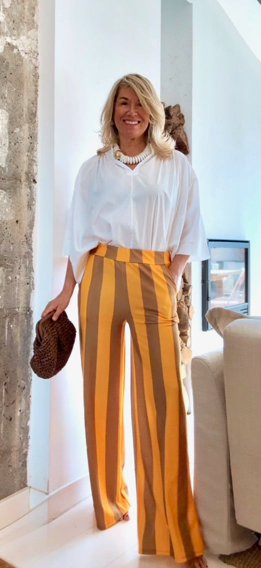 Disponible en color en estampado de rayas amarillas y marrones. Talla única.