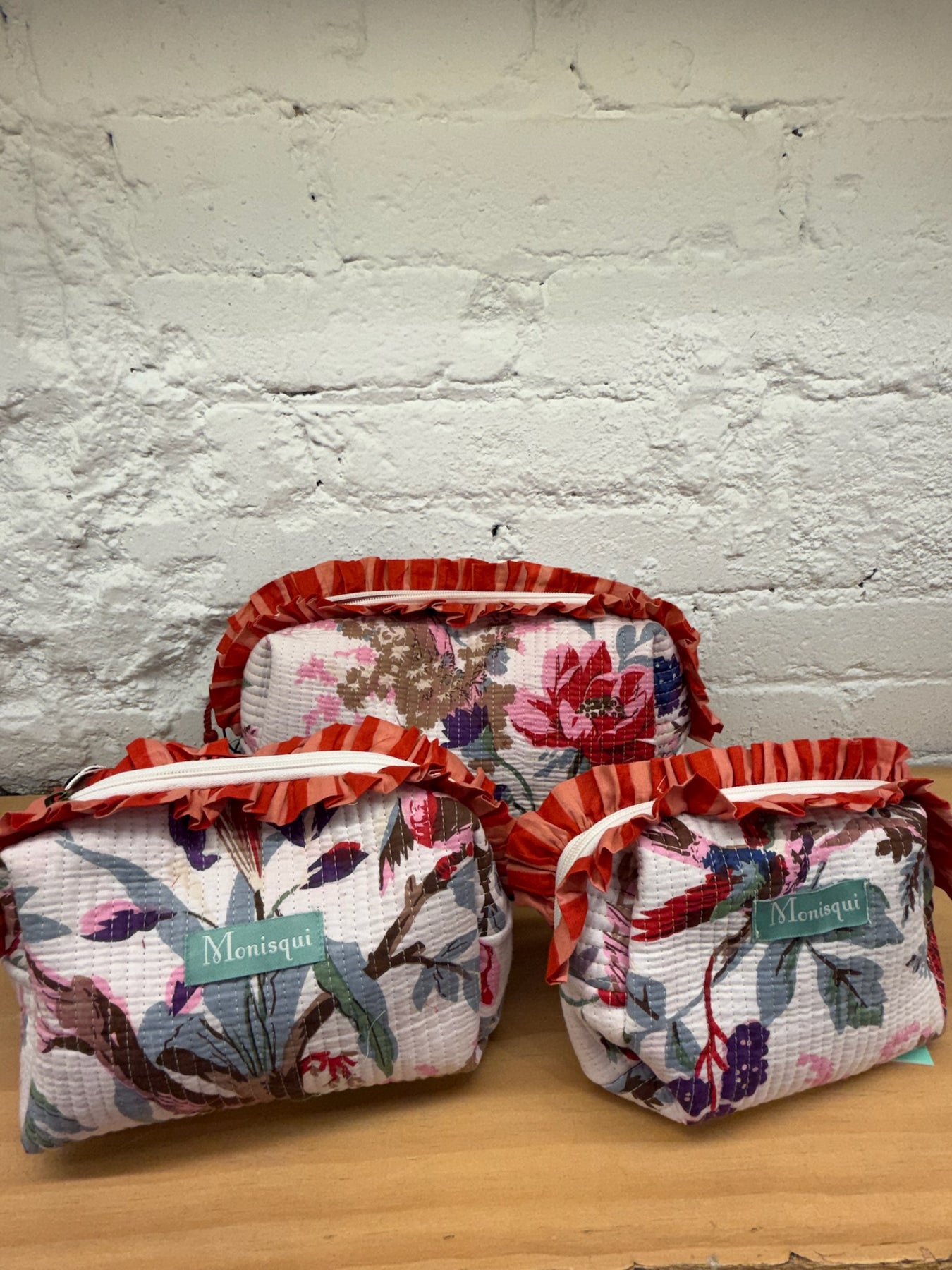 Neceser acolchado. Cierre de cremallera con borla decorativa y un volante fruncido alrededor del borde.