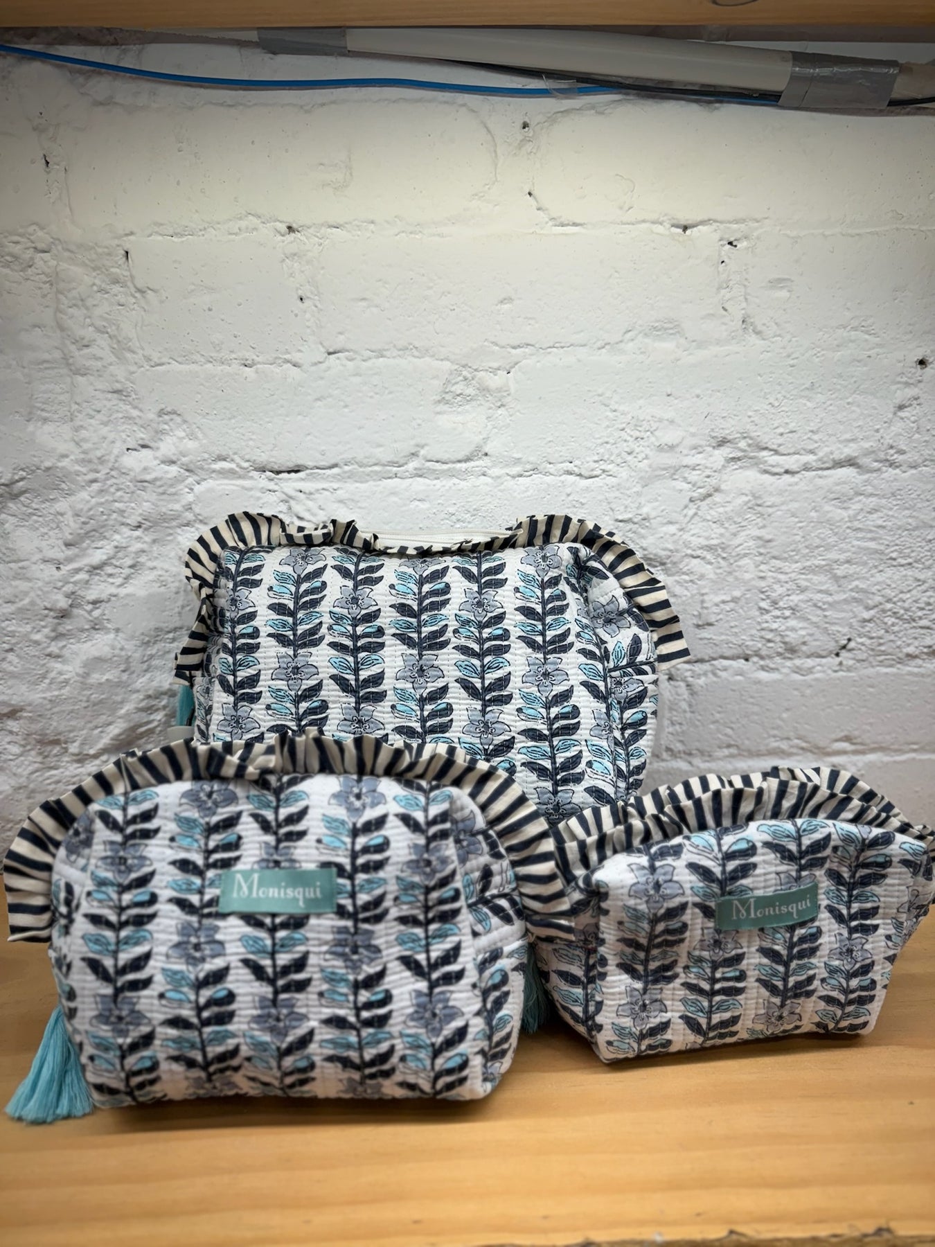 Neceser acolchado. Cierre de cremallera con borla decorativa y un volante fruncido alrededor del borde.