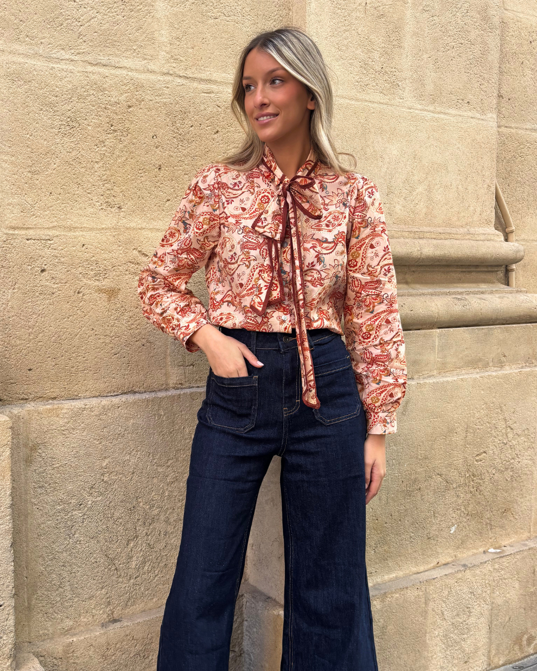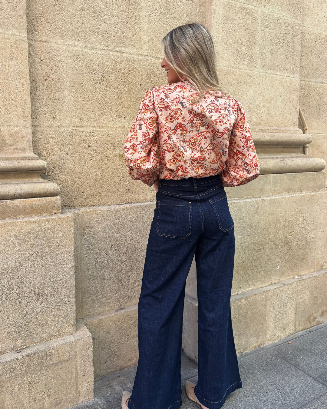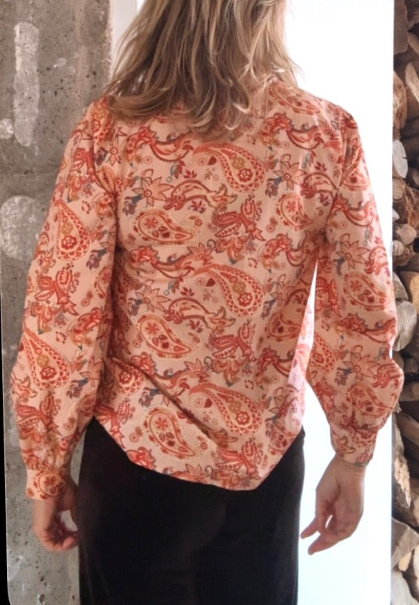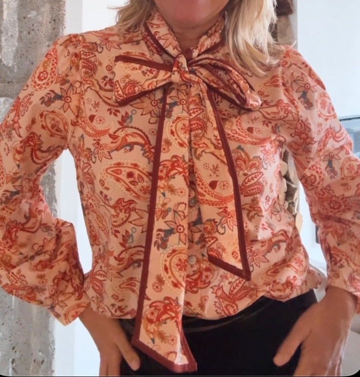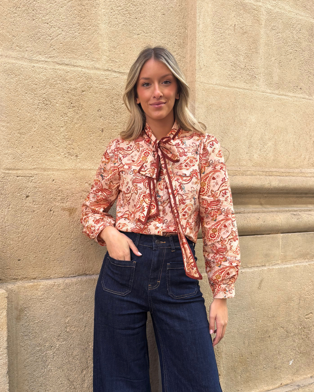 Diseño exclusivo con estampado paisley en tonos teja, mostaza y rosa empolvado. 3 tallas disponibles.