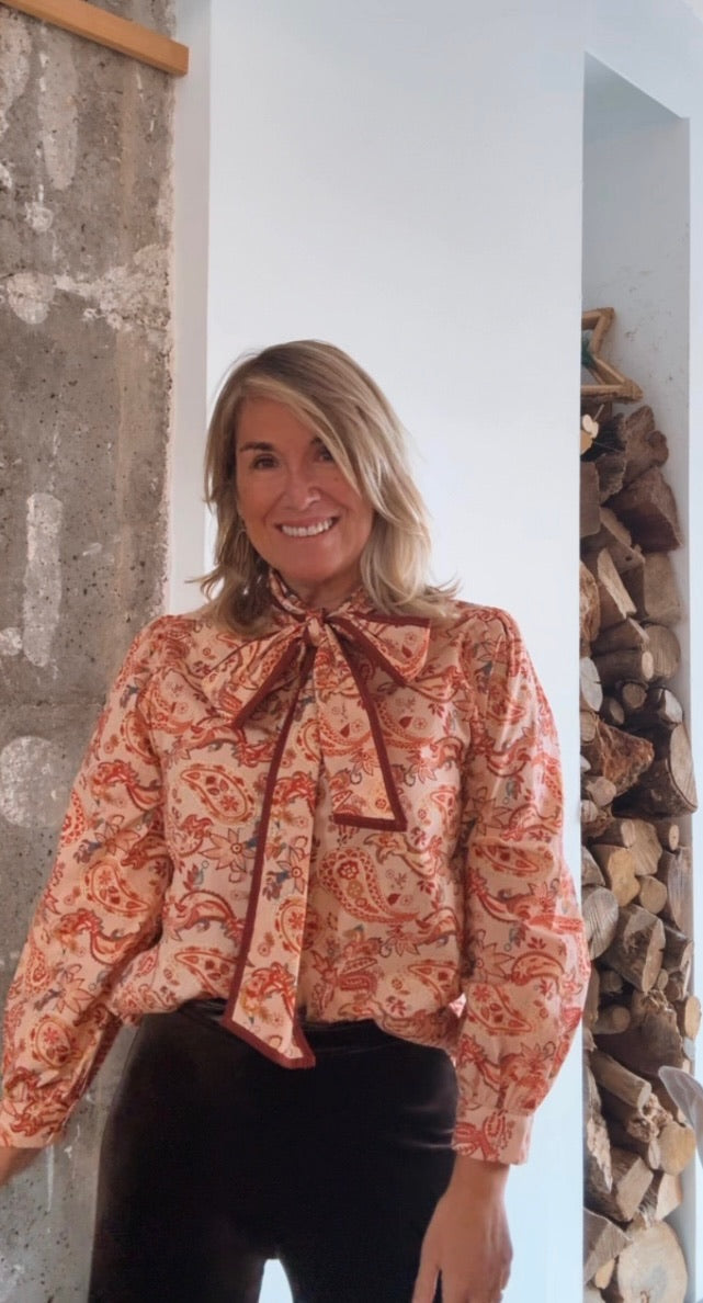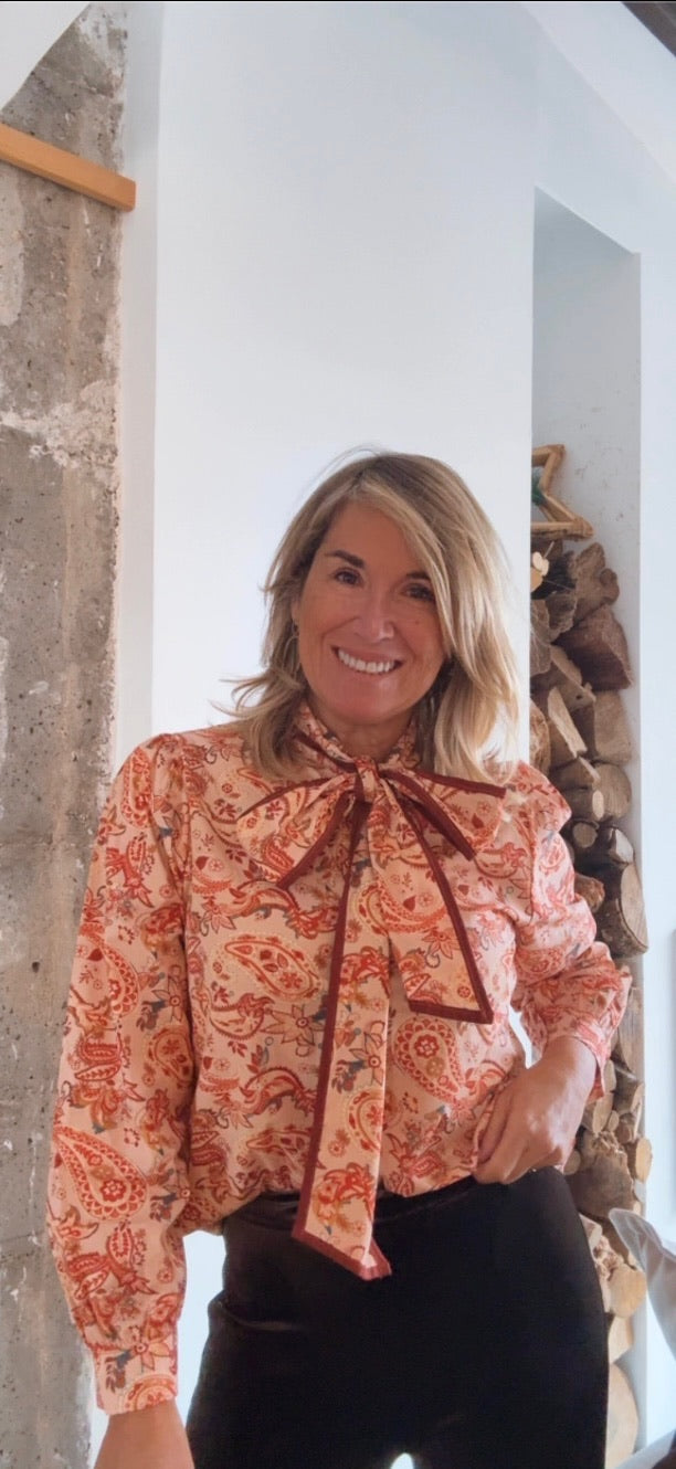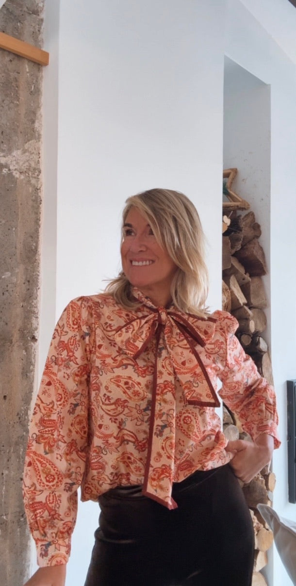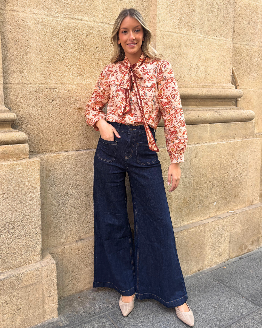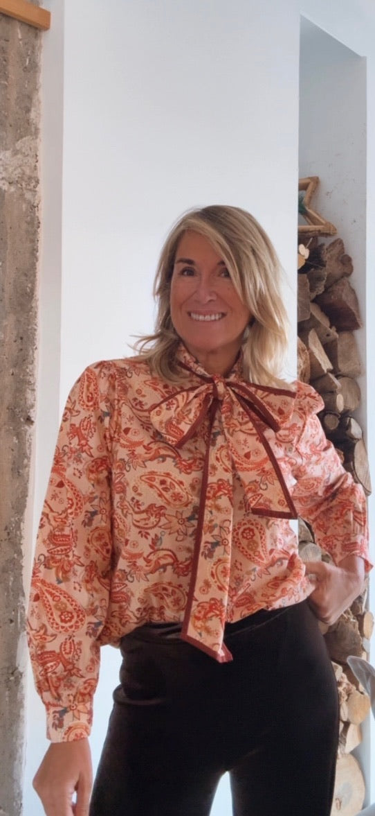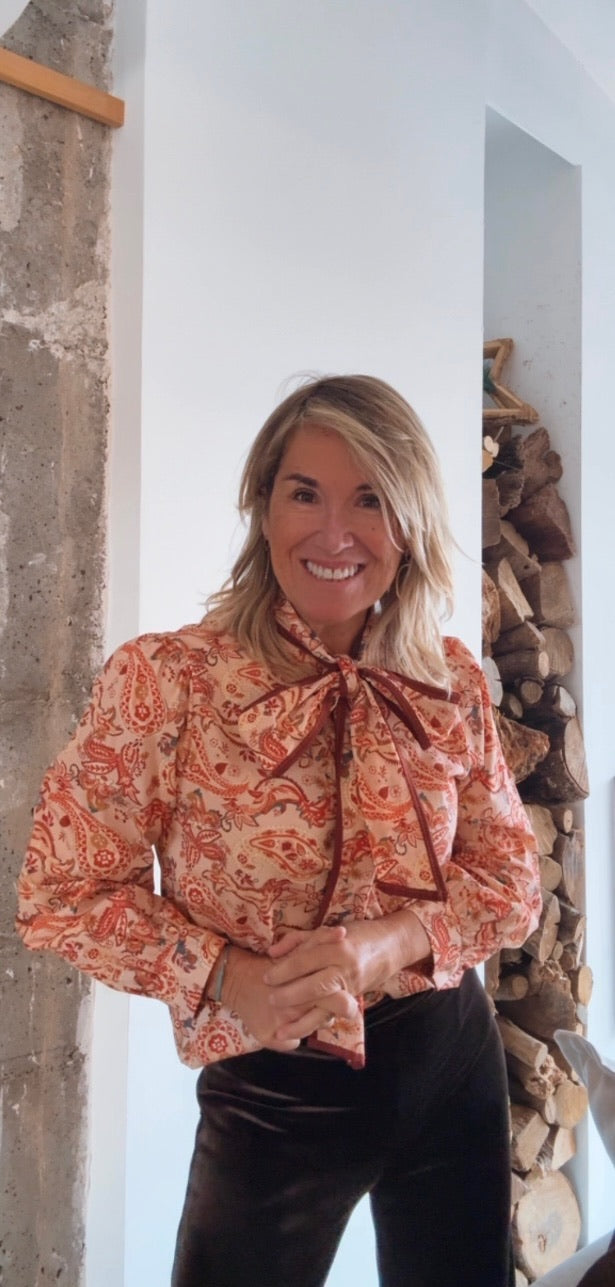 Diseño exclusivo con estampado paisley en tonos teja, mostaza y rosa empolvado. 3 tallas disponibles.