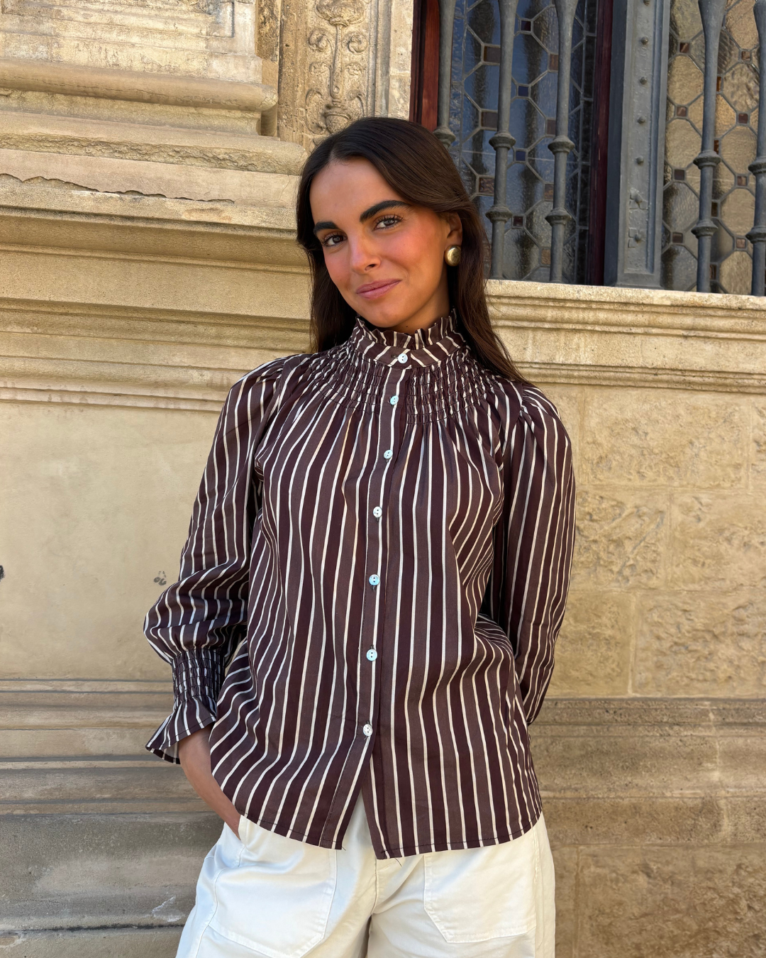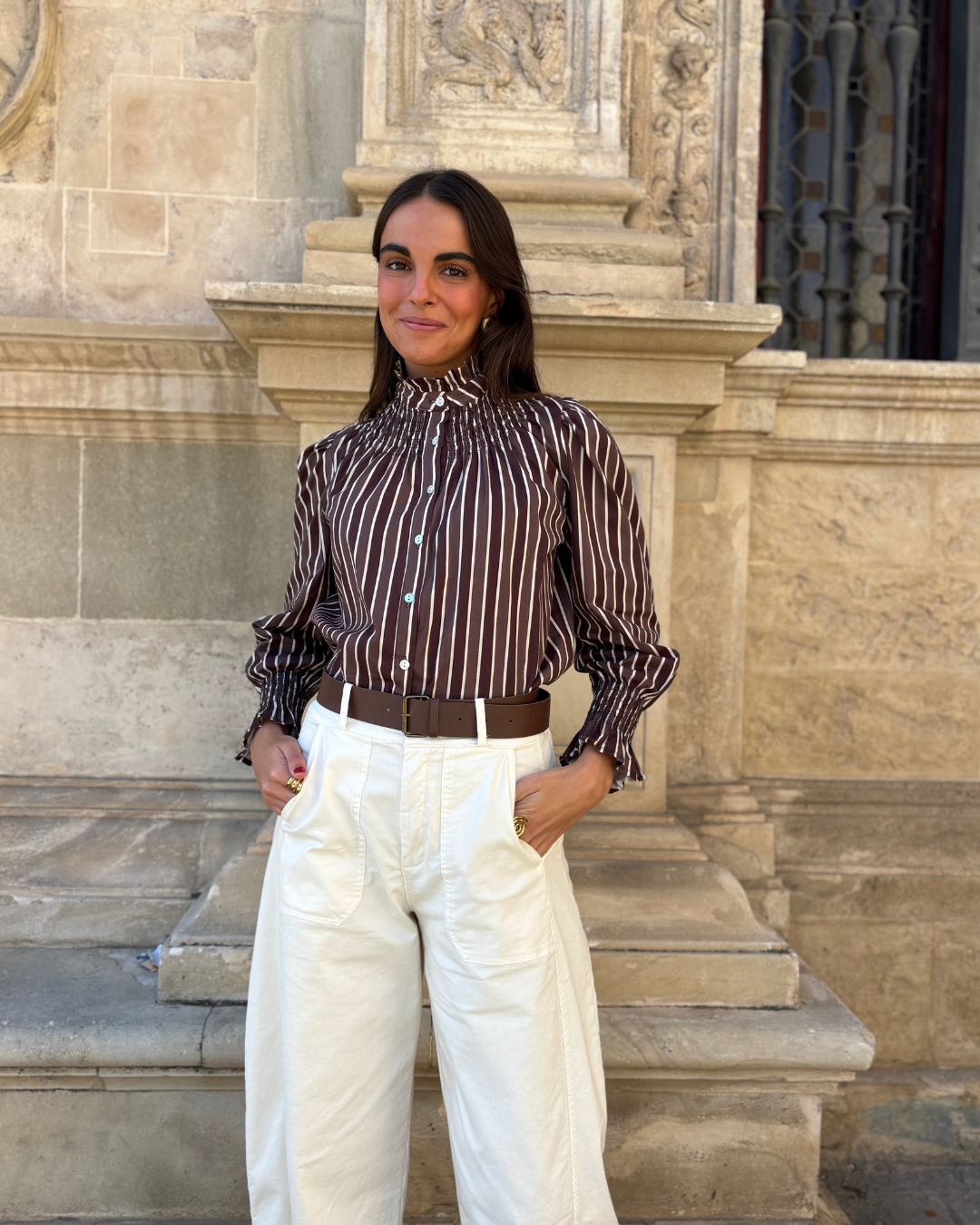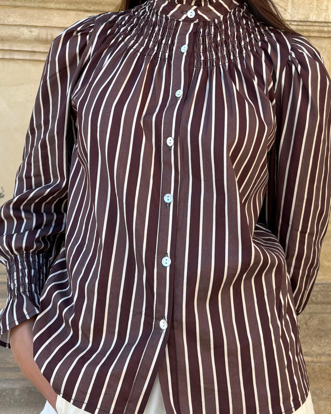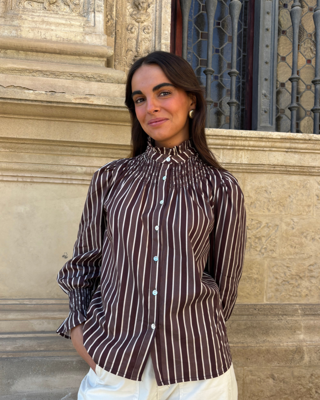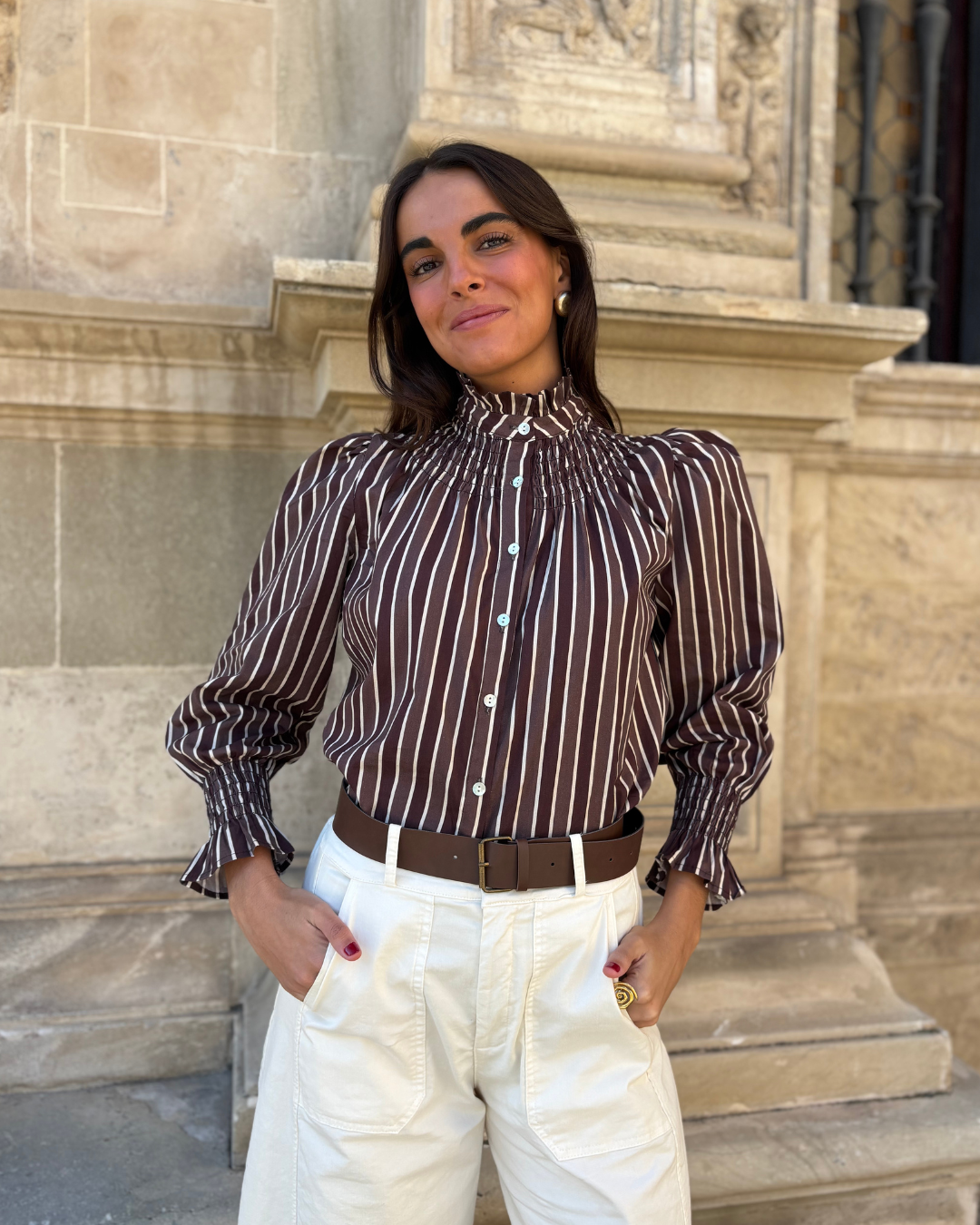 Blusa de cuello francés abotonada. Mangas largas ligeramente abullonadas con puños de goma elástica en nido de abeja.