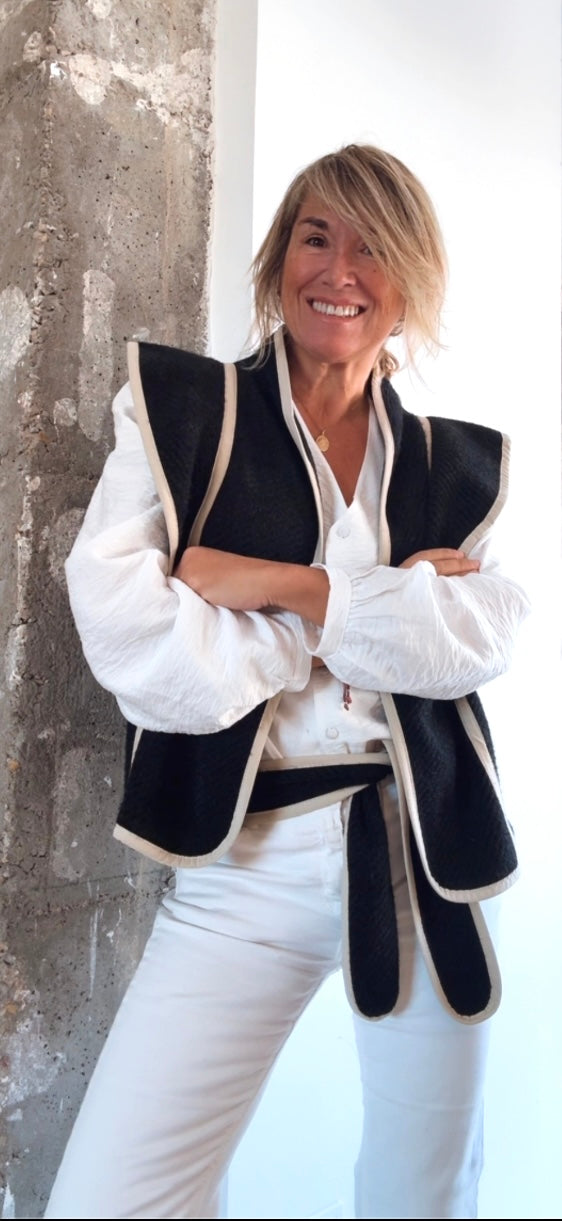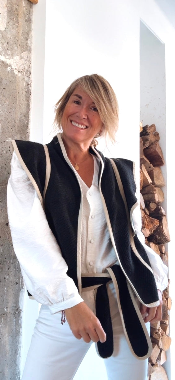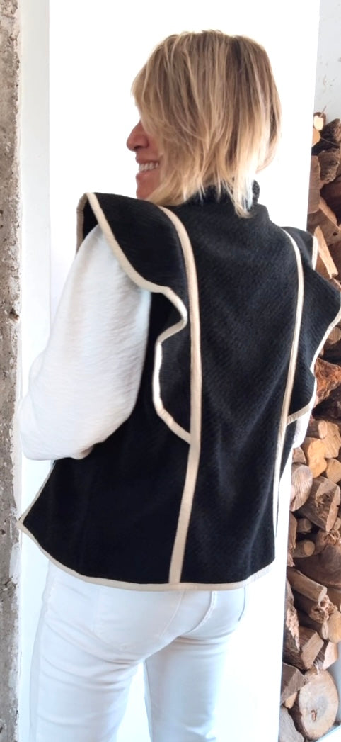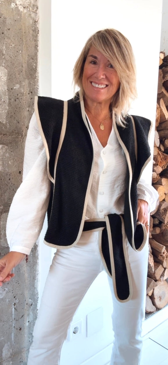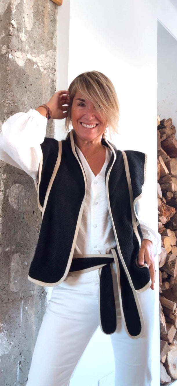 Chaleco sin mangas negro. Presenta ribetes en contraste en color blanco en todo el contorno. Corte recto. Cinturón ajustable en la cintura.