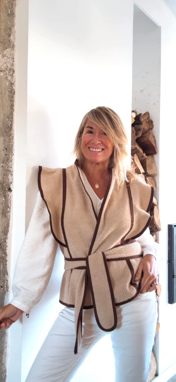 Chaleco sin mangas beige. Presenta ribetes en contraste en color chocolate en todo el contorno. Corte recto. Cinturón ajustable en la cintura.