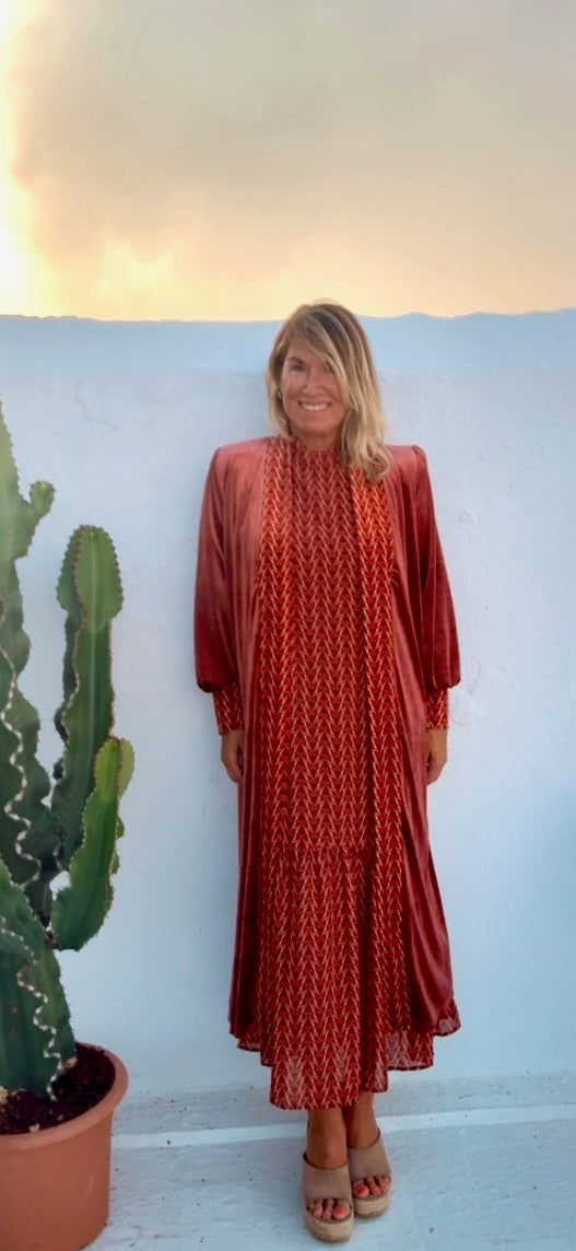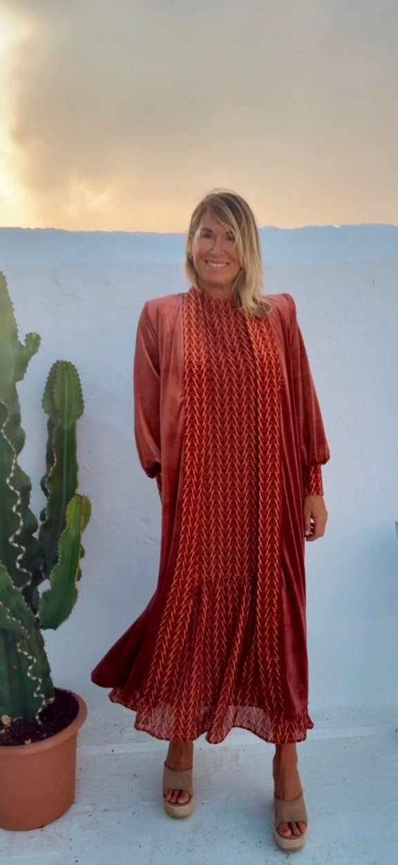 Kimono largo. Corte recto. Diseño con ribetes en terciopelo en mangas y estructura en color caldero. Mangas largas. Diseño abierto y sin cierre.