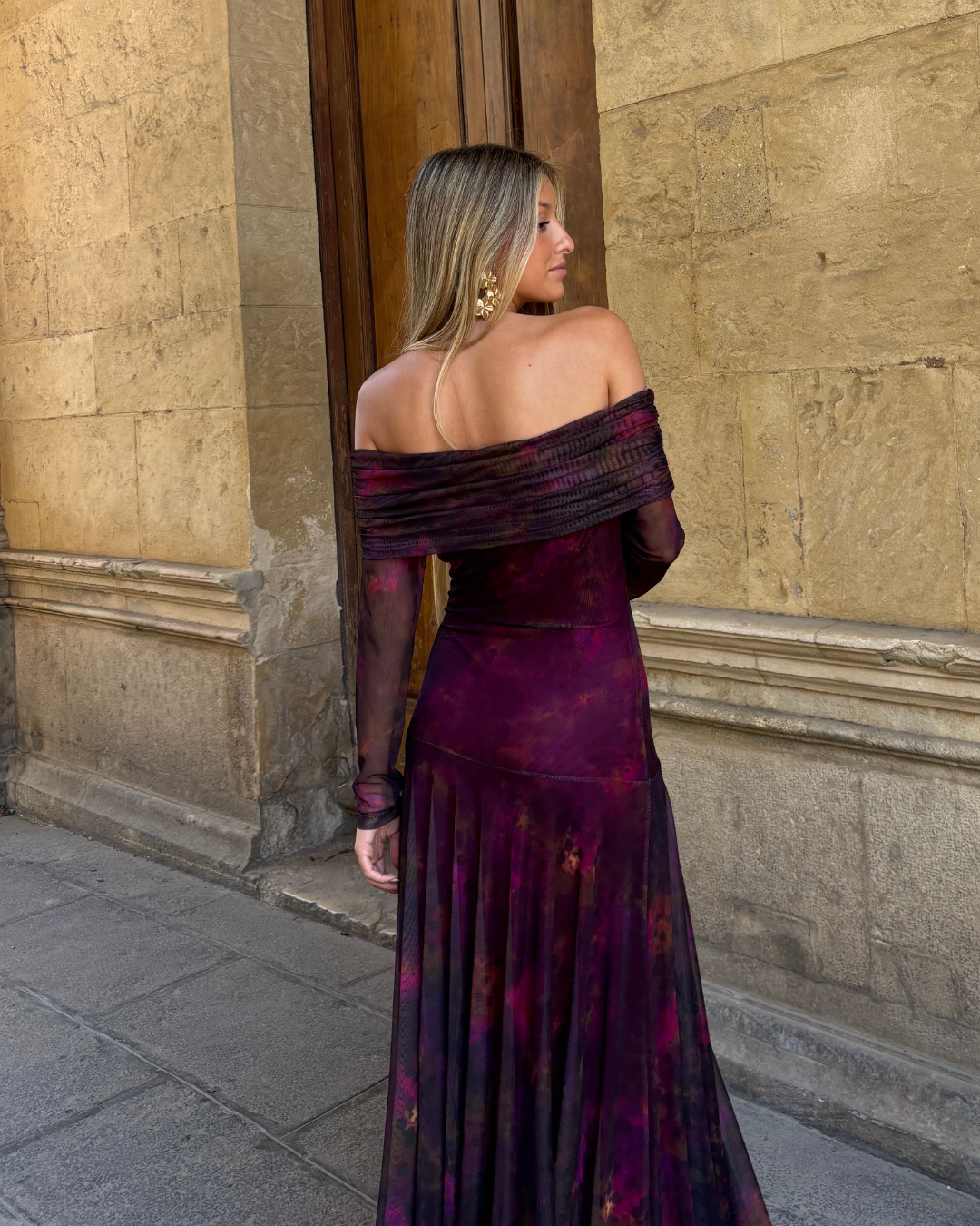 Vestido de tul, largo, estampado en tonos negro, rosa y morado de escote off shoulder y manga larga. Falda fluida, ideal para ocasiones especiales y salidas elegantes.