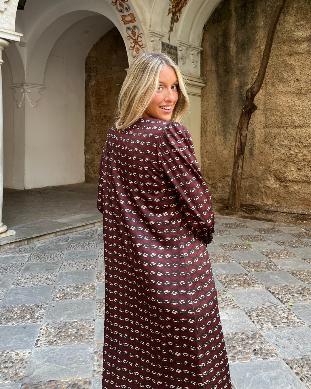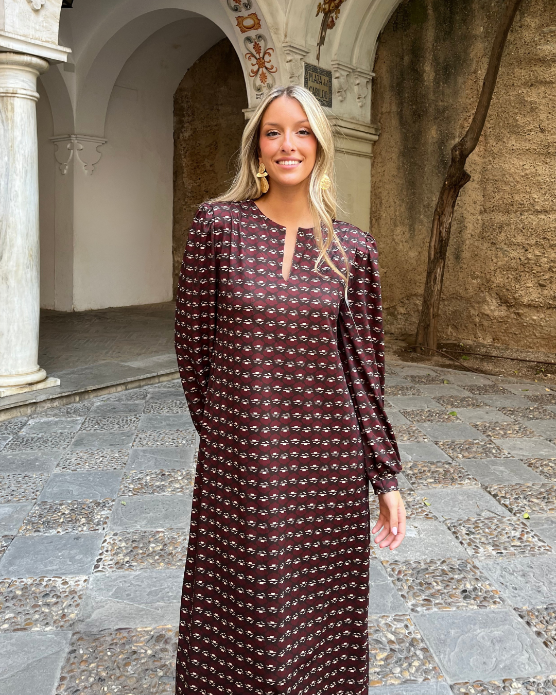 Vestido largo. Escote en "V". Corte recto y fluido. Manga larga.