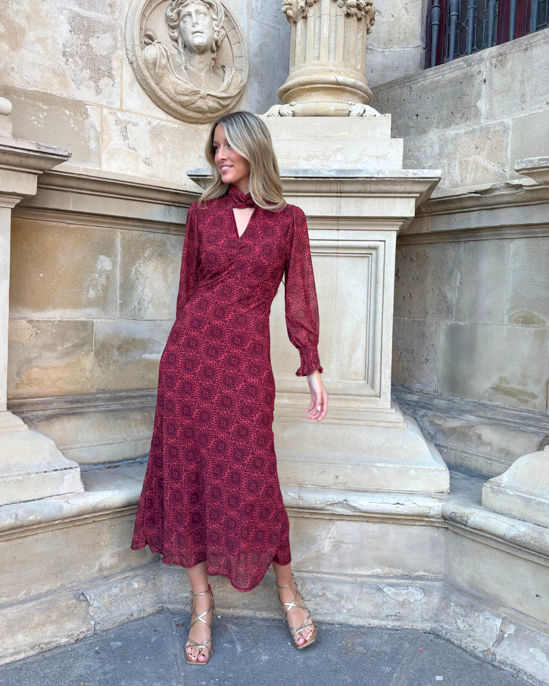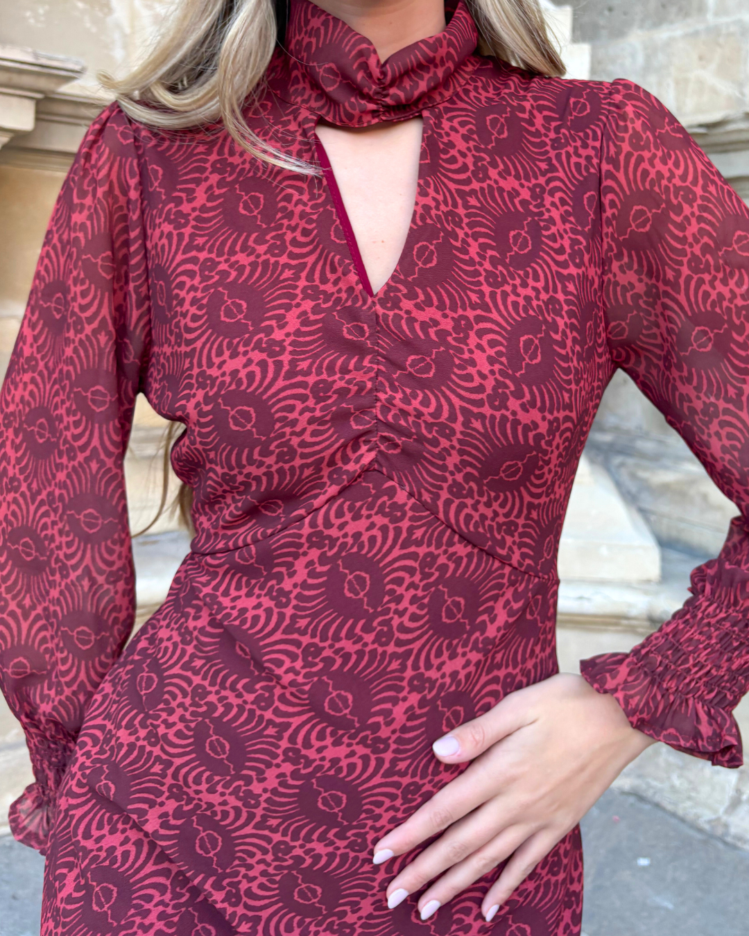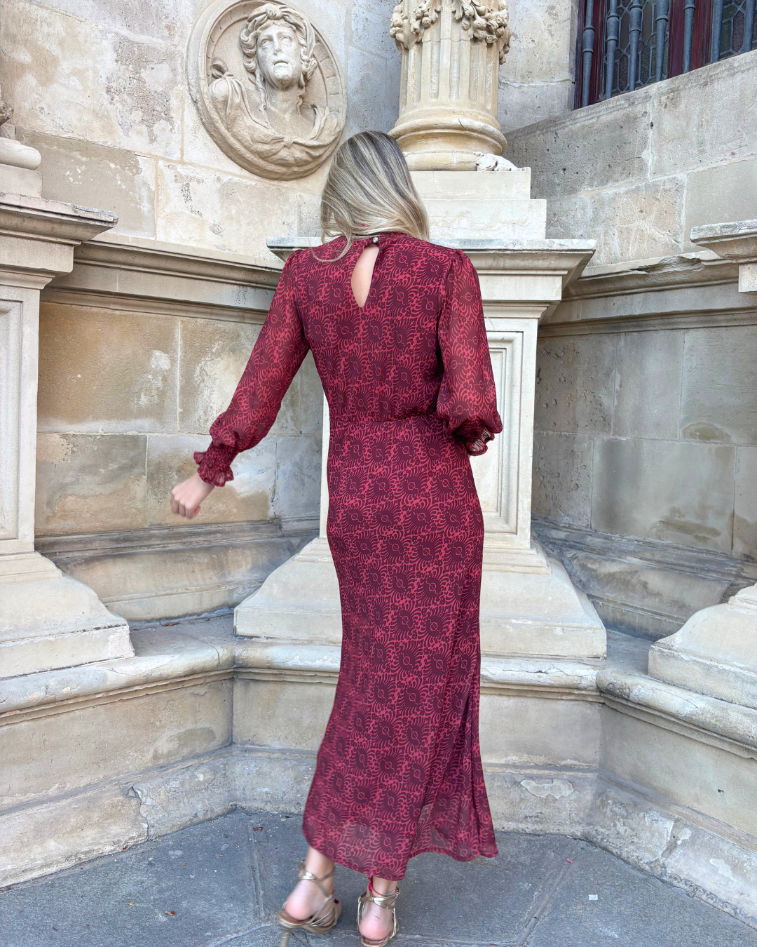 Vestido midi. Escote en V con pequeña abertura. Mangas largas con puño fruncido. Corte ligeramente entallado en el torso que se abre en una falda evasé
