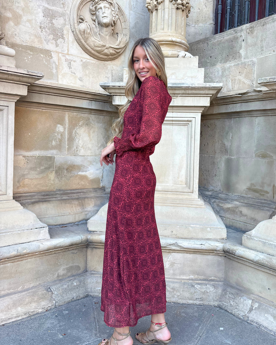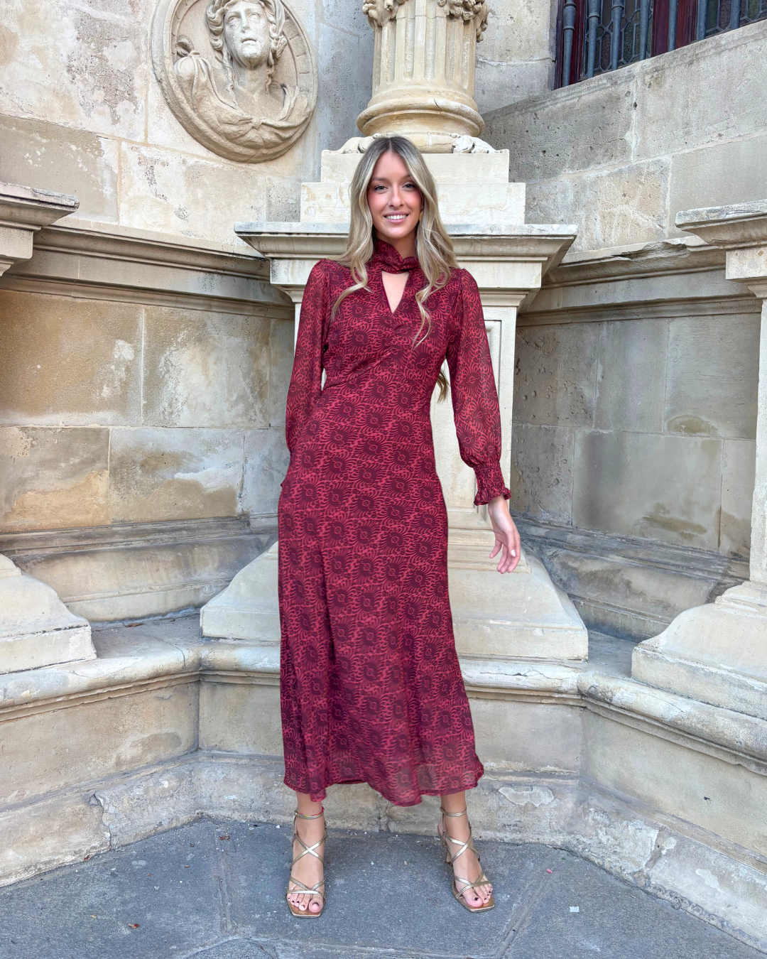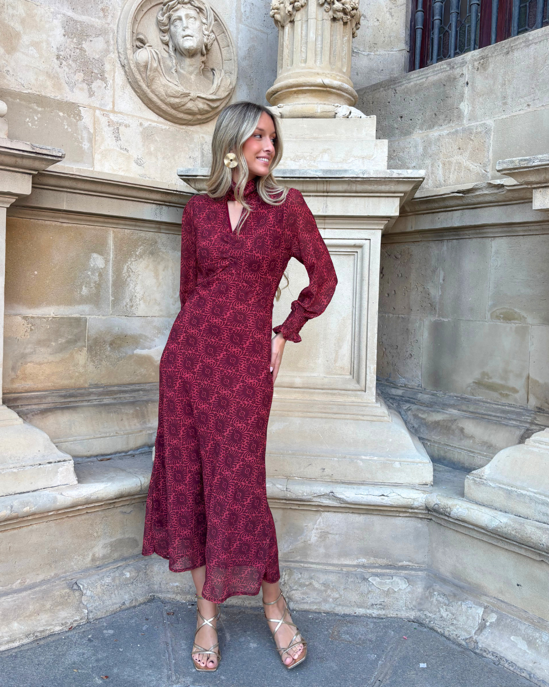 Vestido midi. Escote en V con pequeña abertura. Mangas largas con puño fruncido. Corte ligeramente entallado en el torso que se abre en una falda evasé
