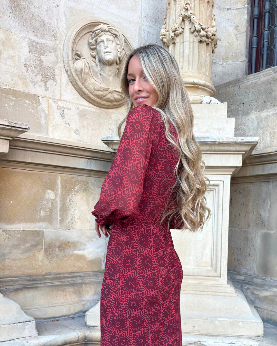 Modelo exclusivo con estampado geométrico en tono burdeos. Disponible en 4 tallas.
