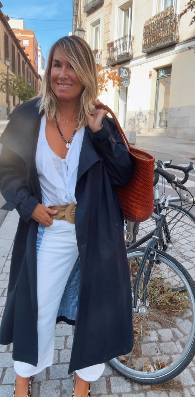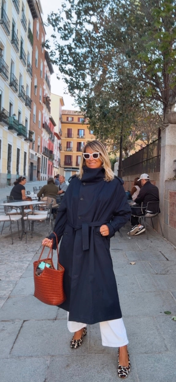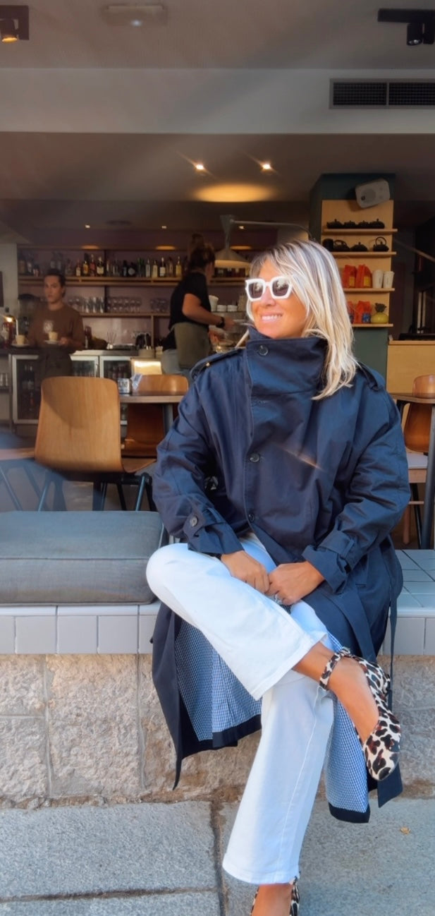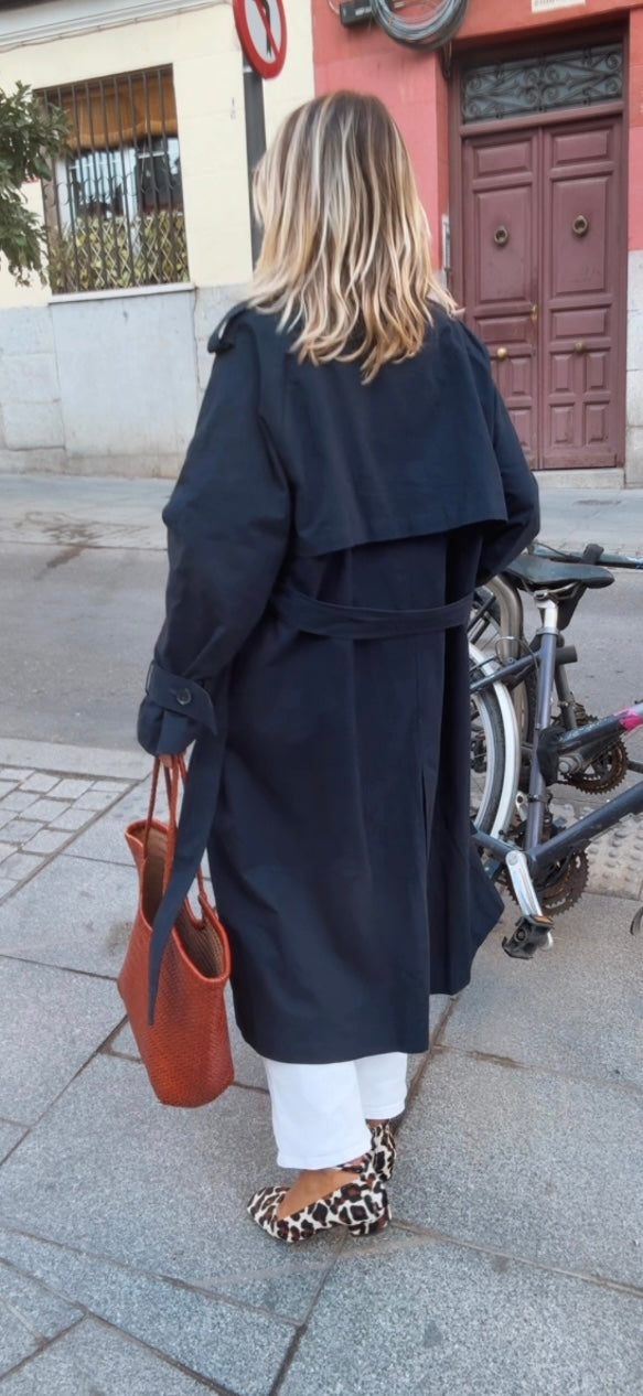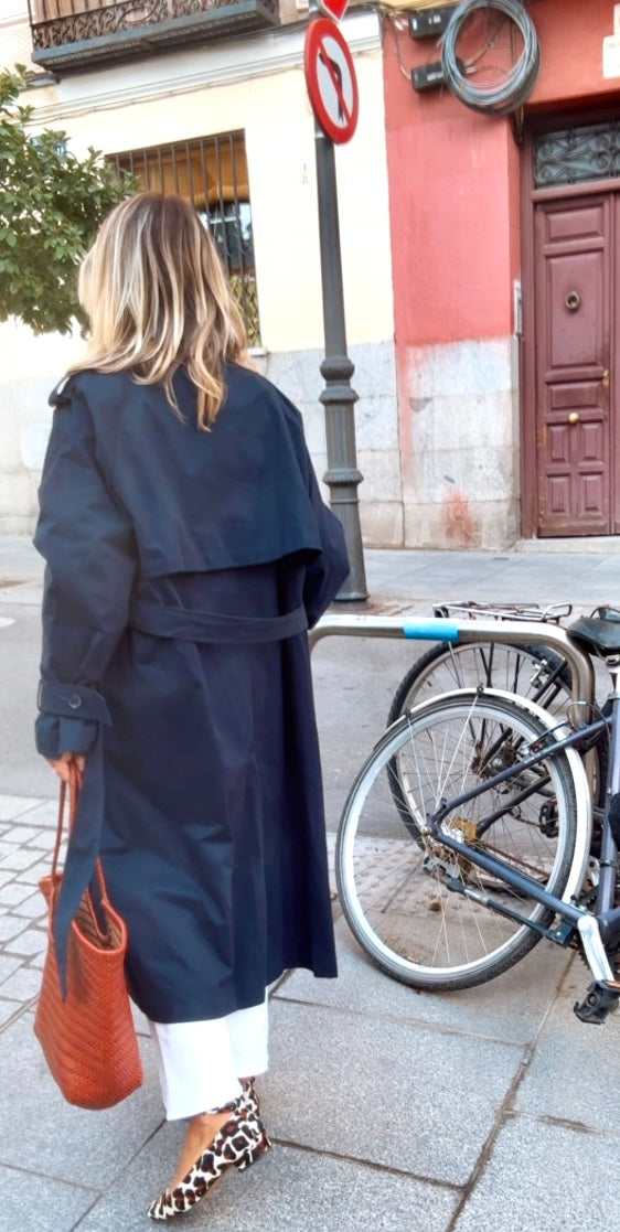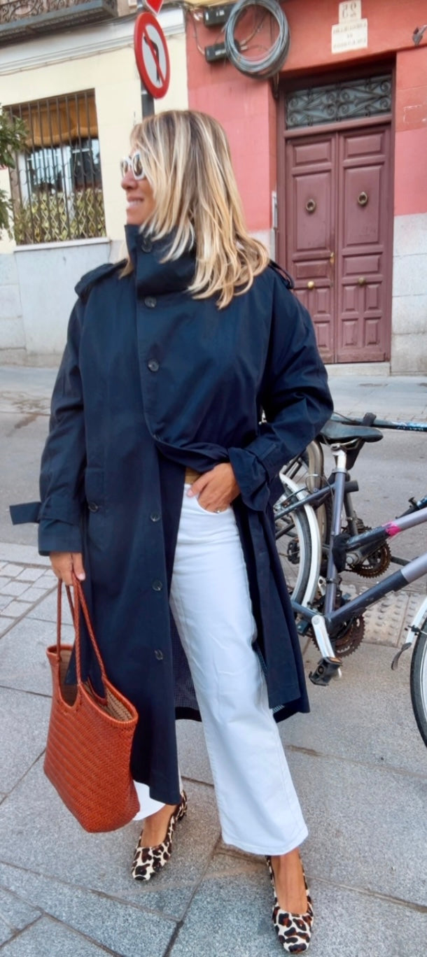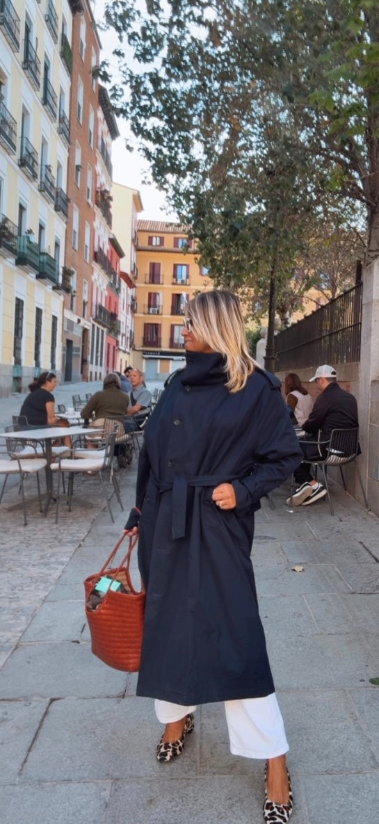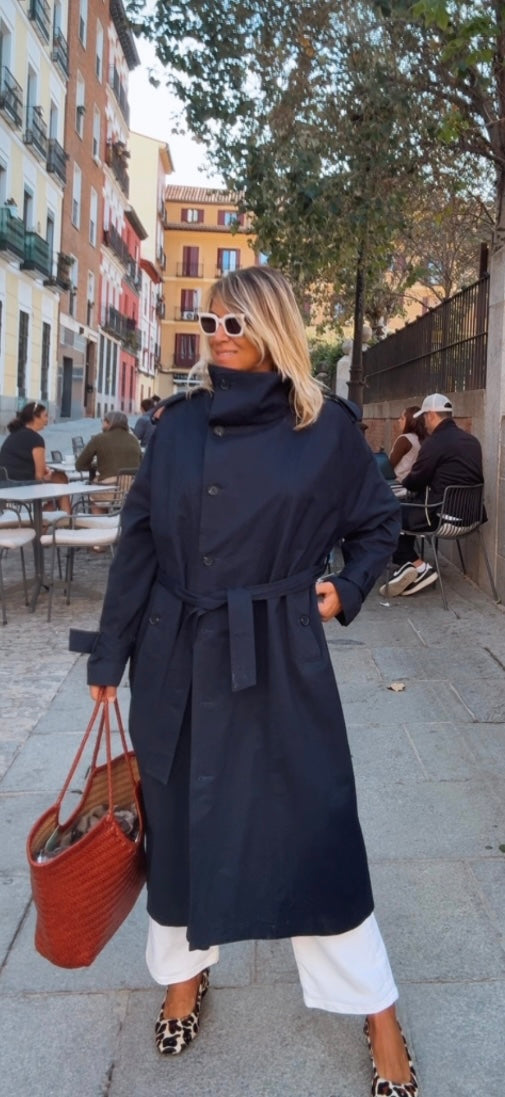 Gabardina larga marino. Corte recto y largo. Cuello alto. Cierre frontal de abotonadura visible con botones grandes. Bolsillos diagonales. Incluye cinturón a juego para ajustar a la cintura.