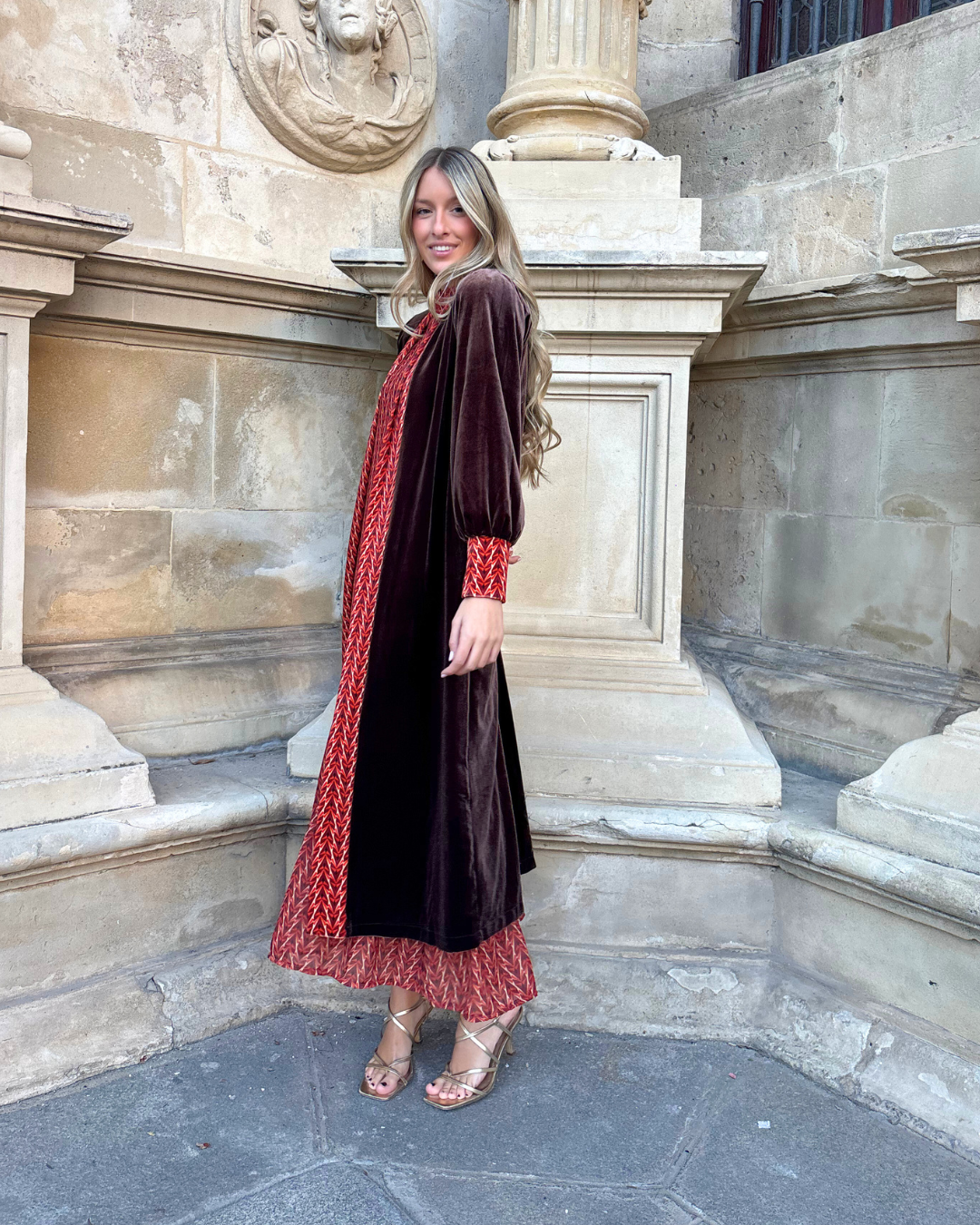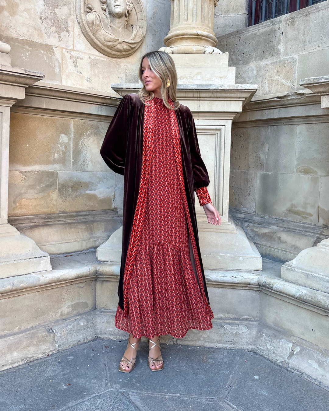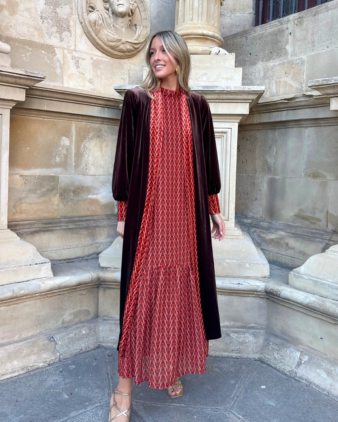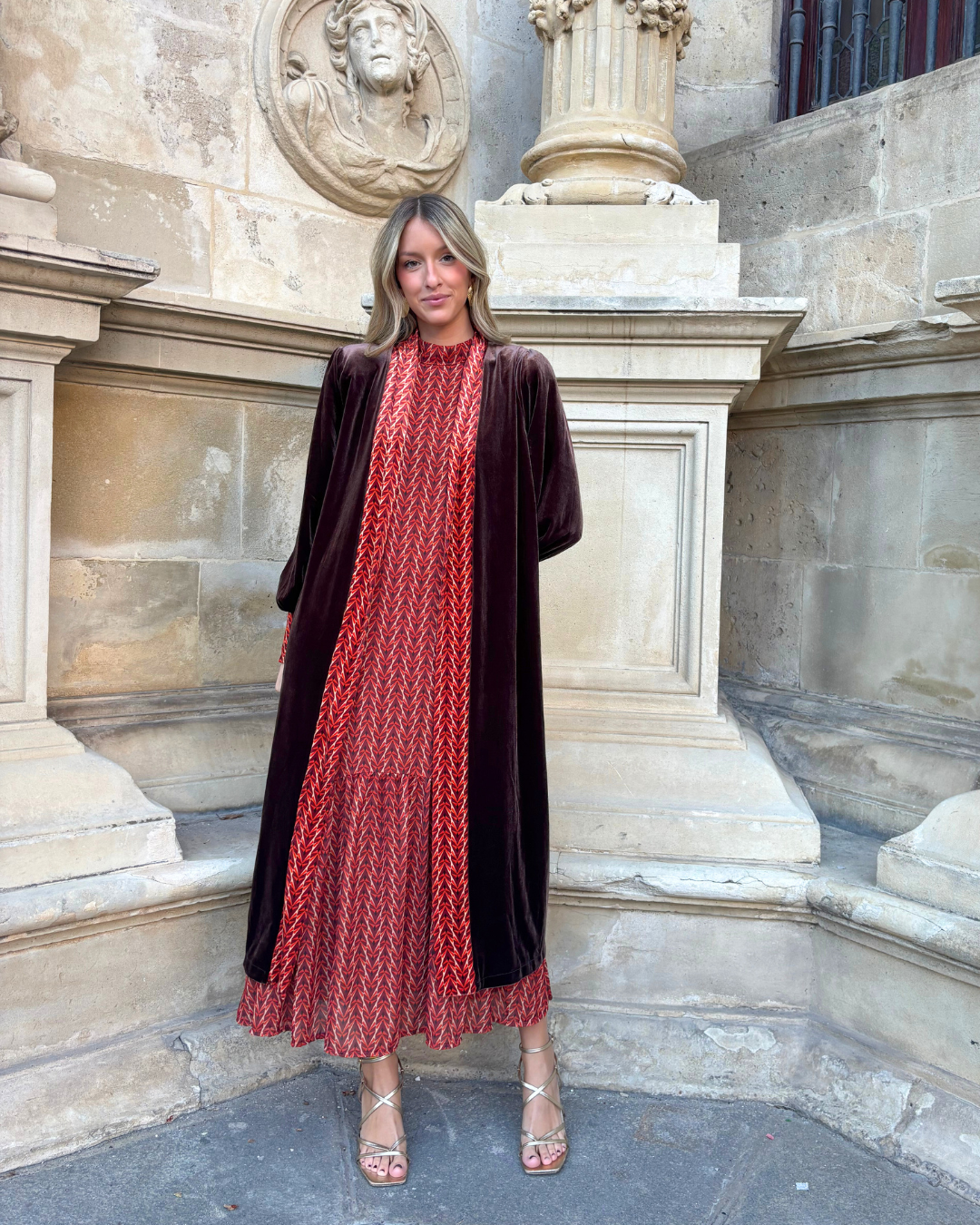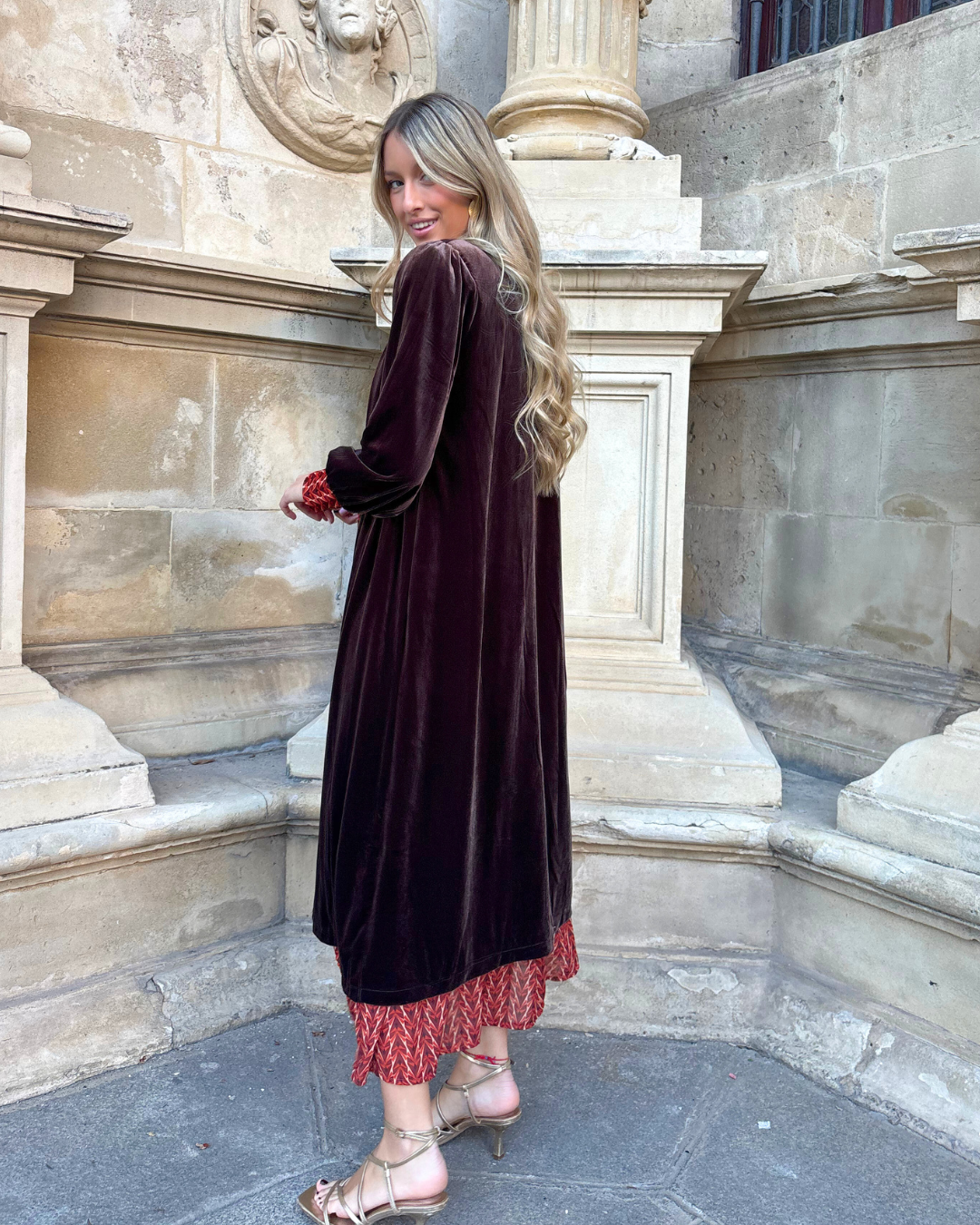 Kimono largo. Corte recto. Diseño con ribetes en terciopelo en mangas y estructura en color caldero. Mangas largas. Diseño abierto y sin cierre.