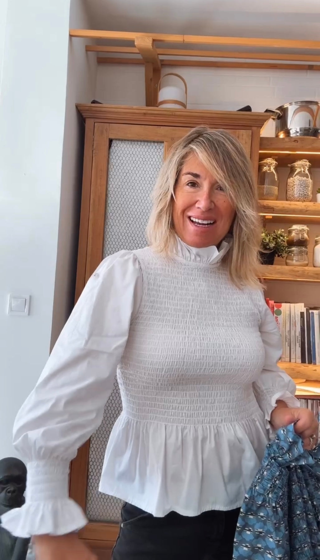 Camisa de manga larga. Escote y cuello redondo tipo mao fruncido. Zona frontal amplia con panel fruncido elástico desde hombros hasta caderas. Corte ajustado al cuerpo.