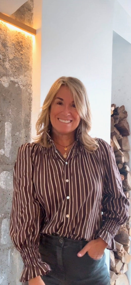 Disponible en estampado de rayas y tonos marrón chocolate y beige. 3 tallas disponibles.
