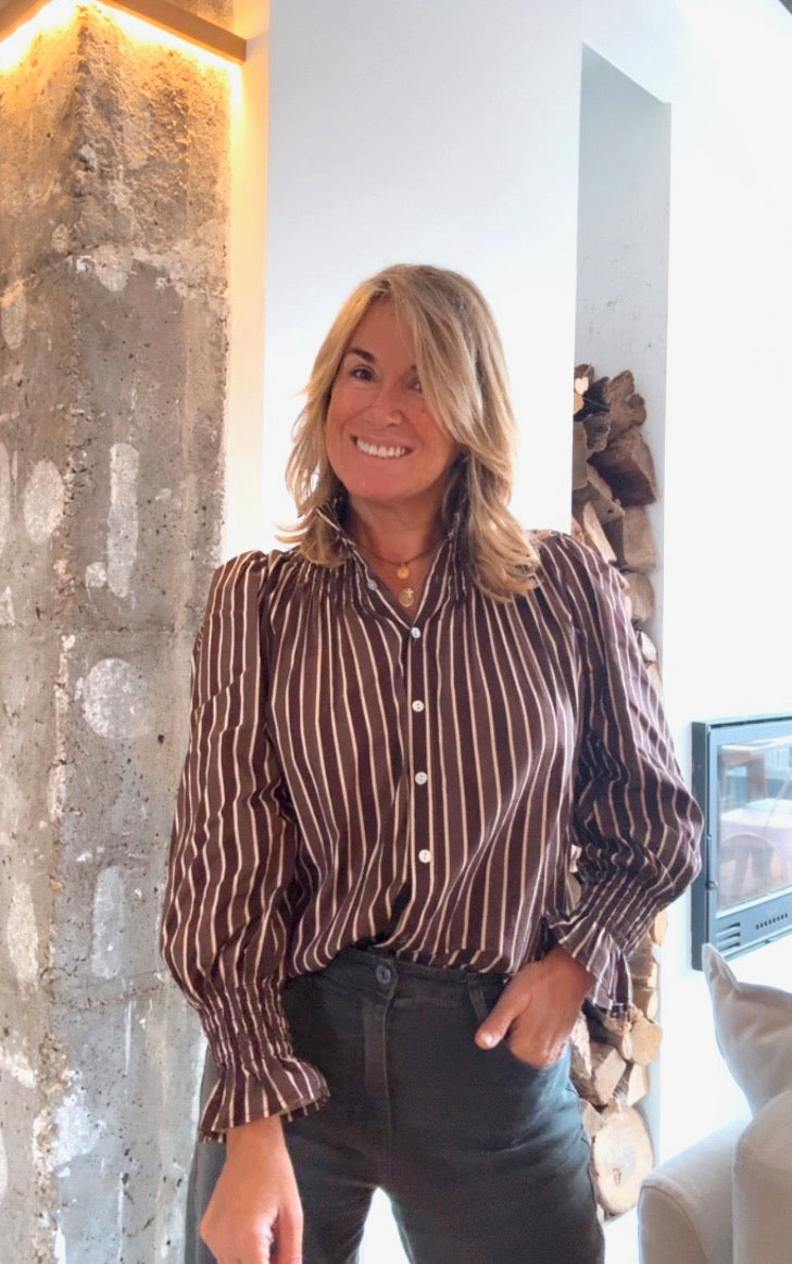 Blusa de cuello francés abotonada. Mangas largas ligeramente abullonadas con puños de goma elástica en nido de abeja.