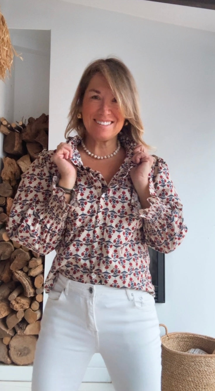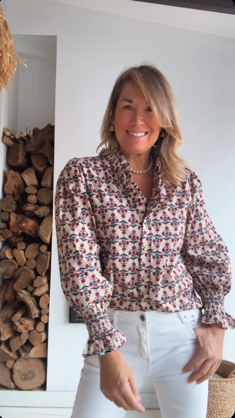 Camisa de manga larga. Cuello en "V" con detalles fruncidos en el cuello. Puños fruncidos.