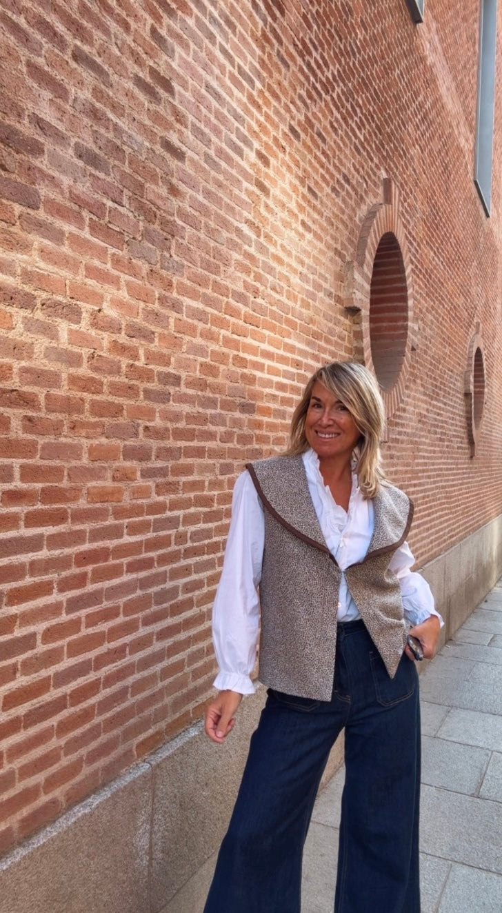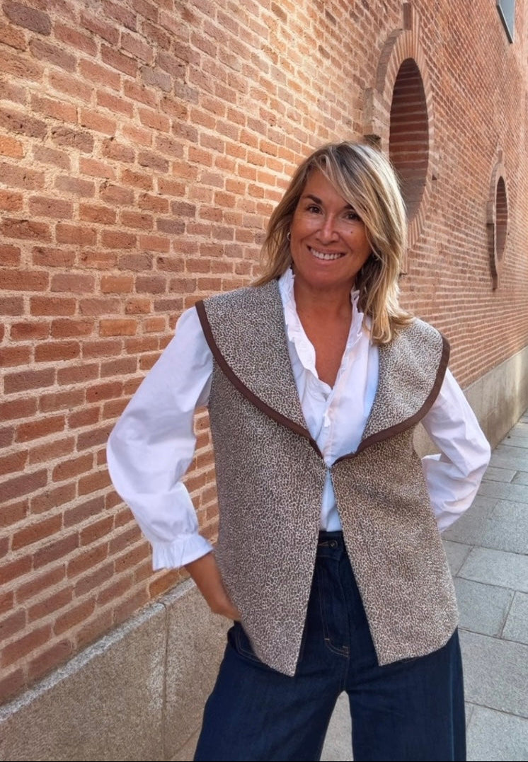 Chaleco midi. Corte recto. Cuello redondo con solapas. Con cierre frontal con corchete.