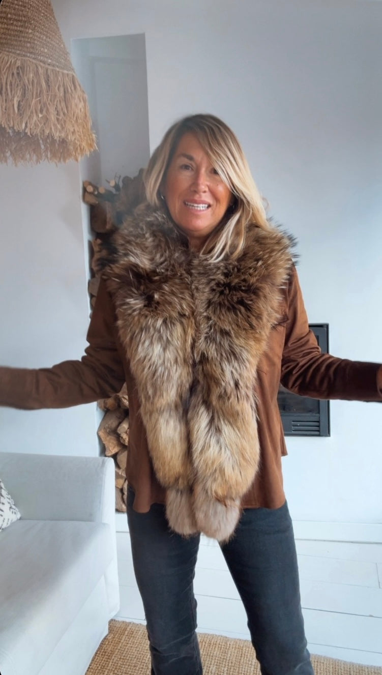 Cuello de pelo natural. Forro en la parte inferior. Cierre mediante una pinza.