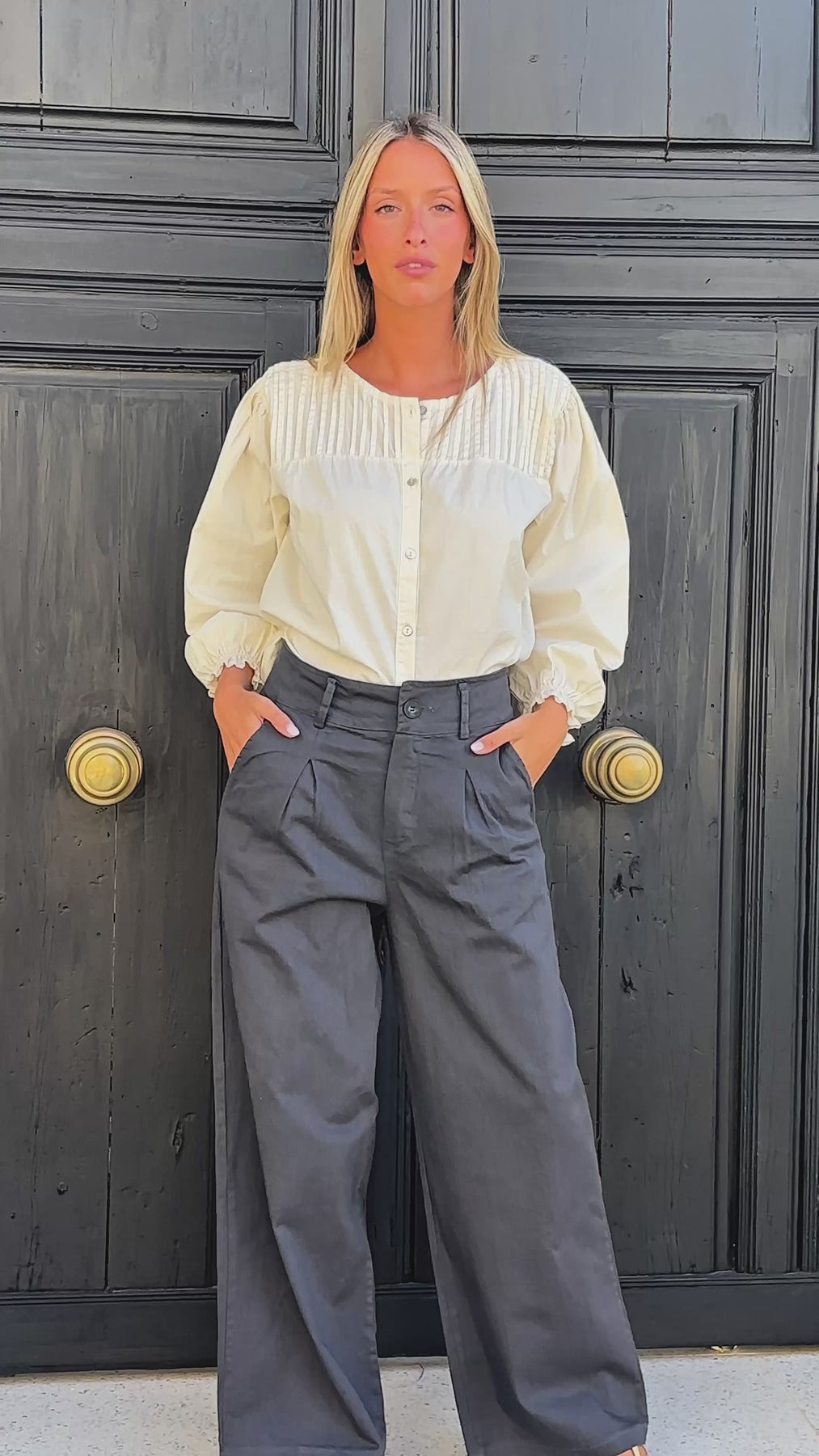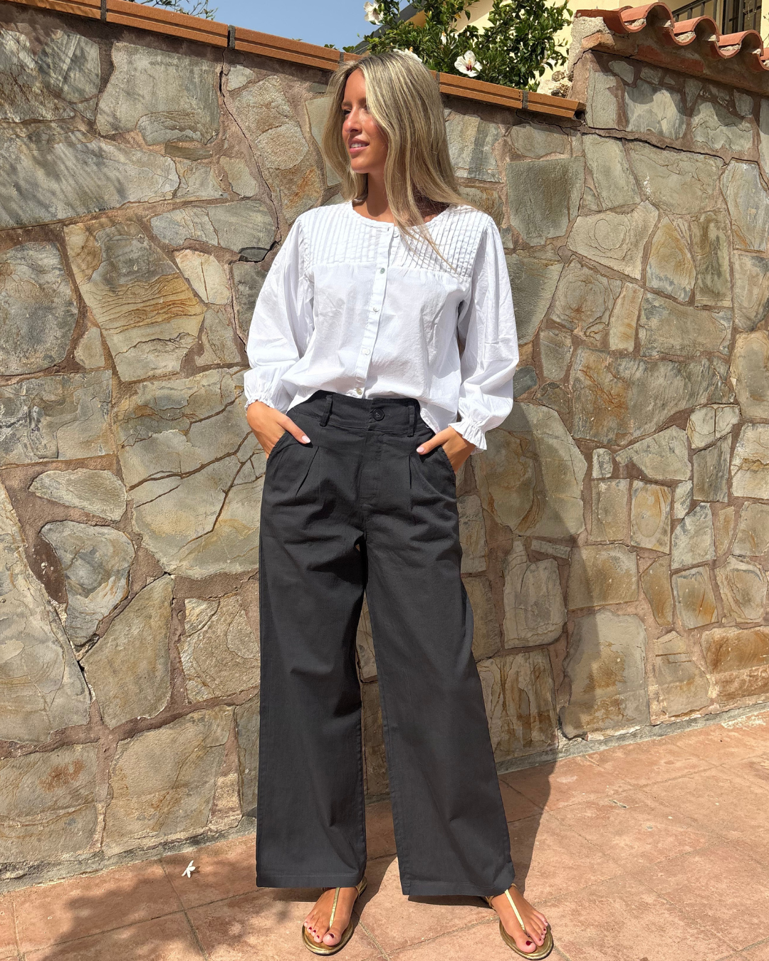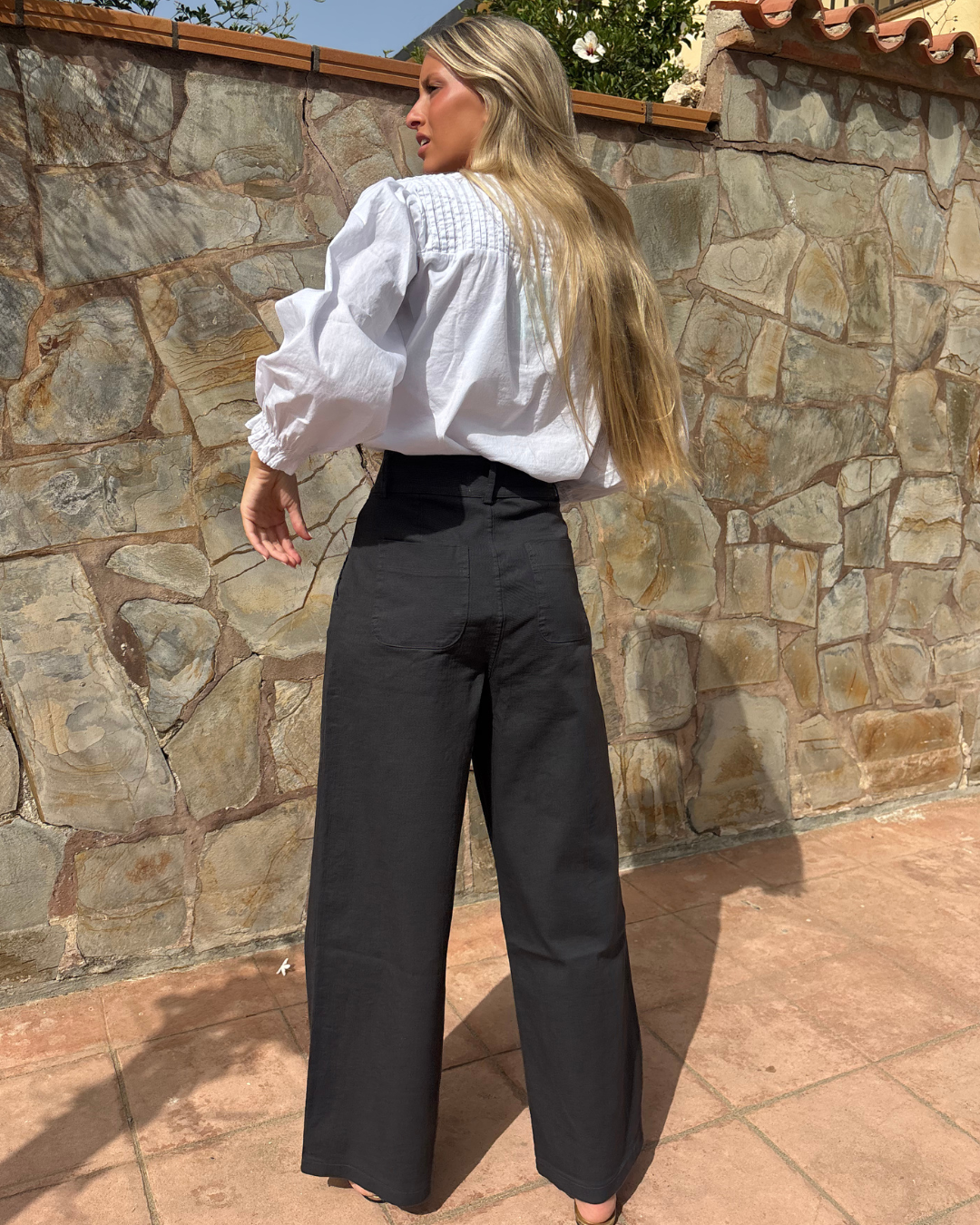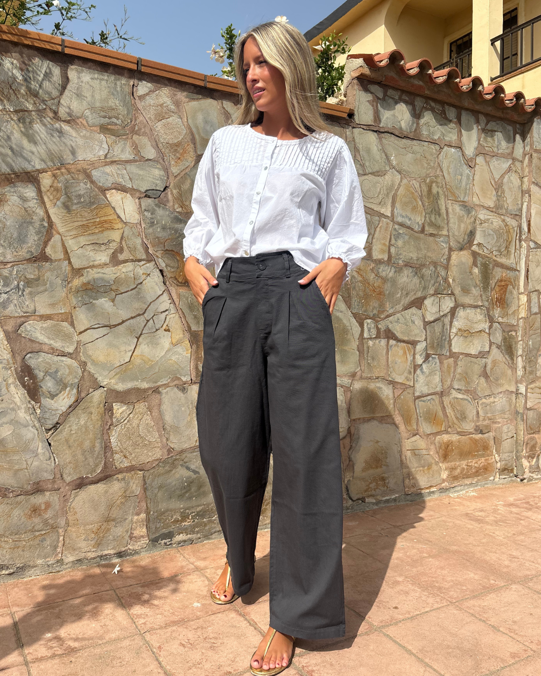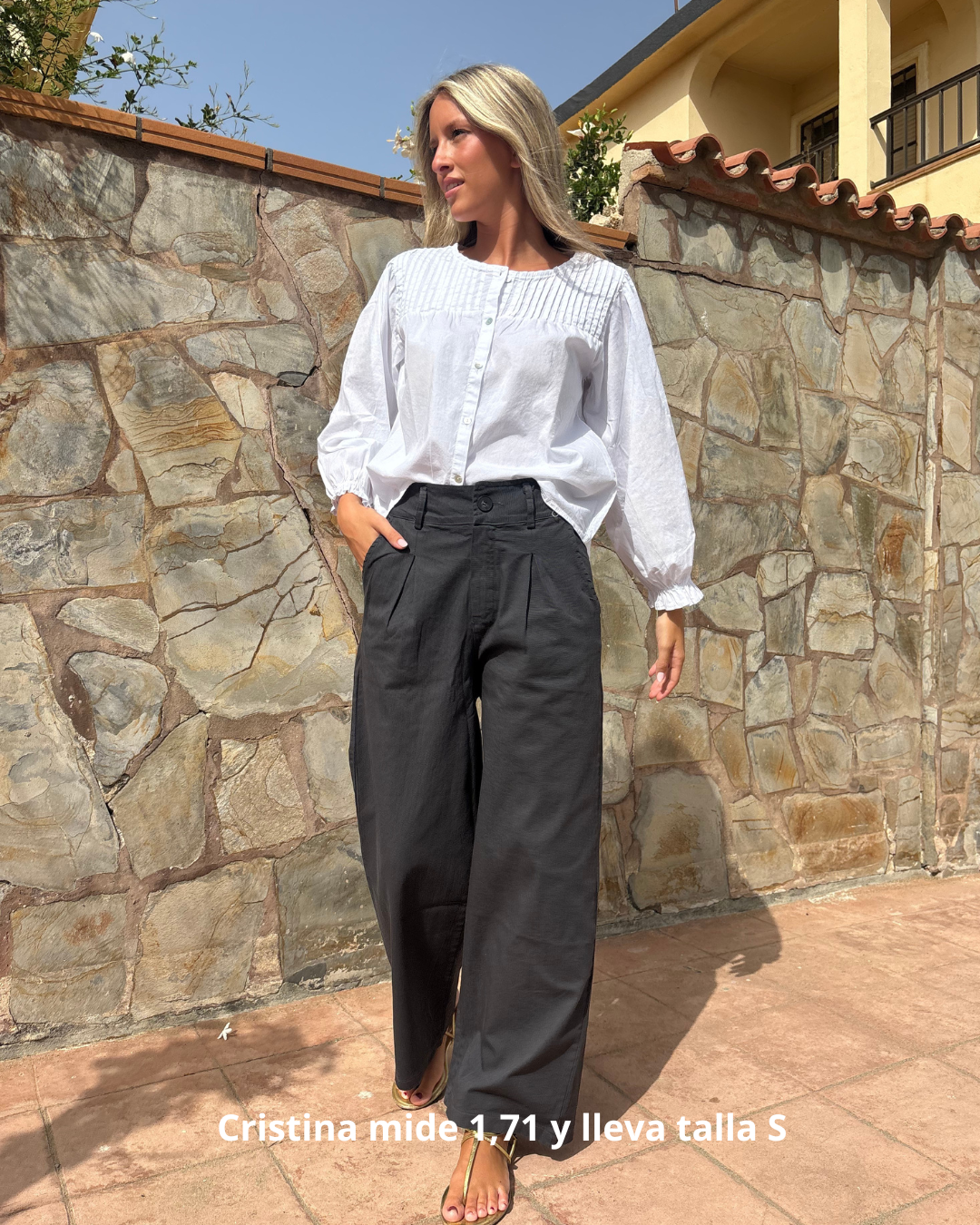 Pantalón de corte recto y pernera ancha. Cierre frontal mediante botón y cremallera. Pinzas frontales y bolsillos laterales.