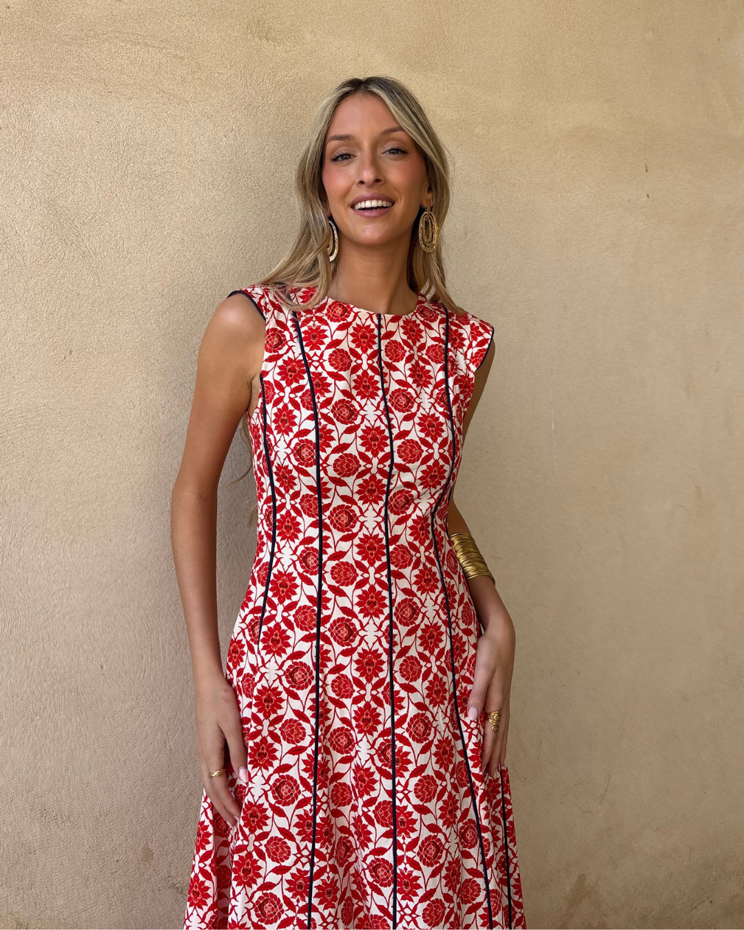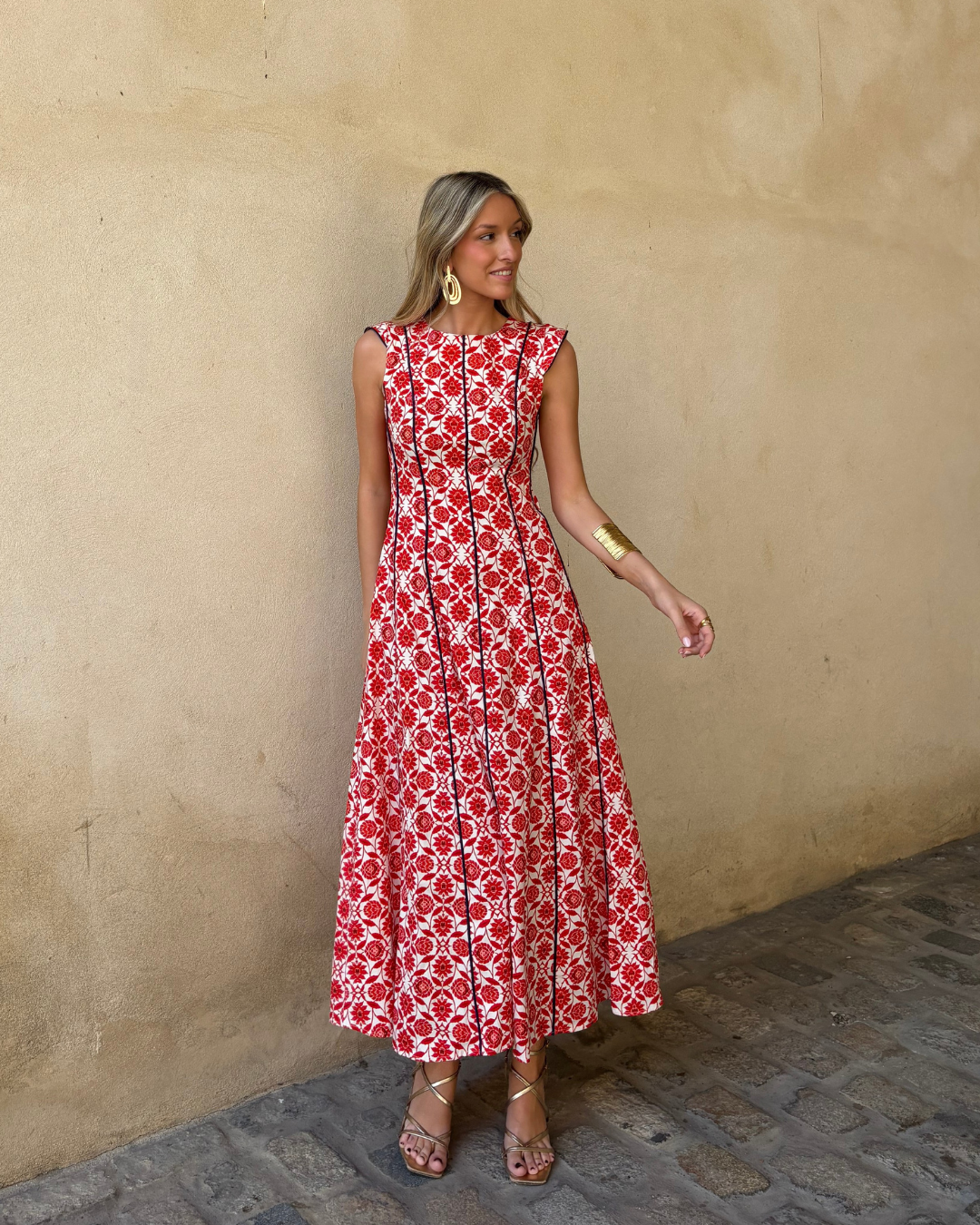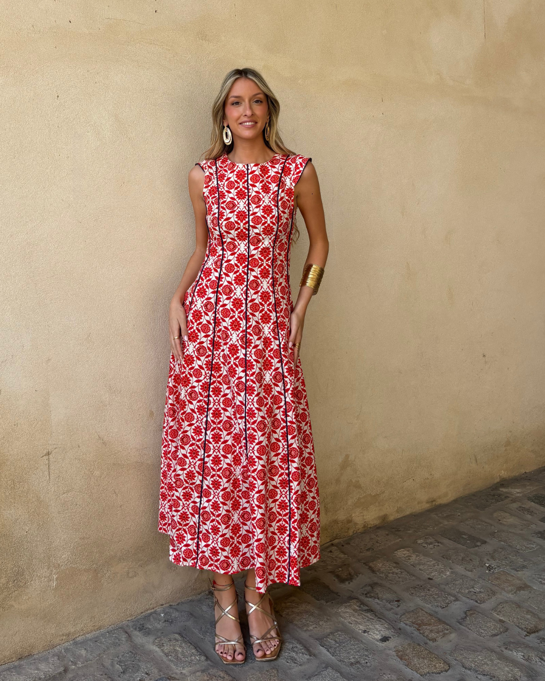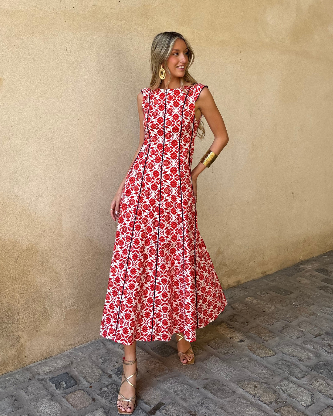Vestido midi estampado con escote redondo y tirantes. Patrón evasé desde la cintura. Cierre de cremallera no visible en la parte trasera.