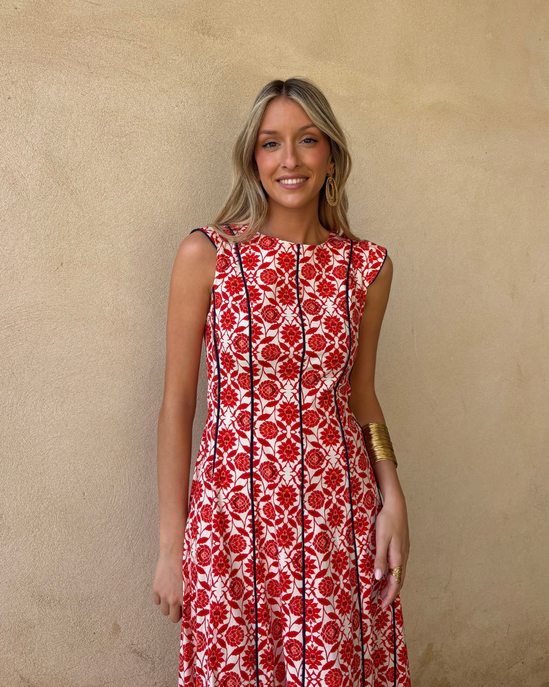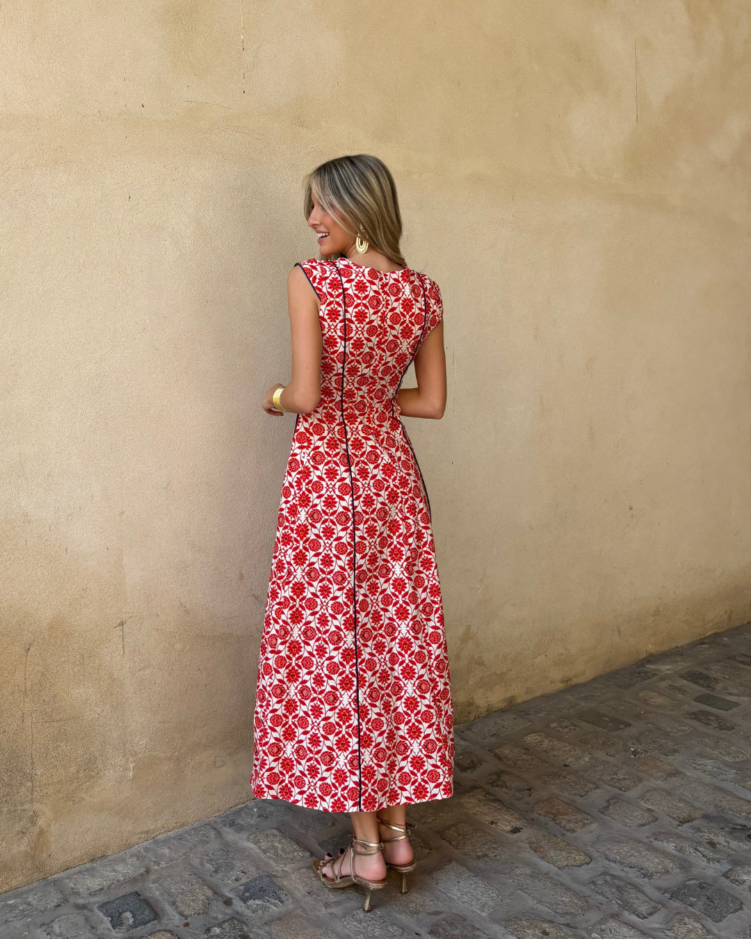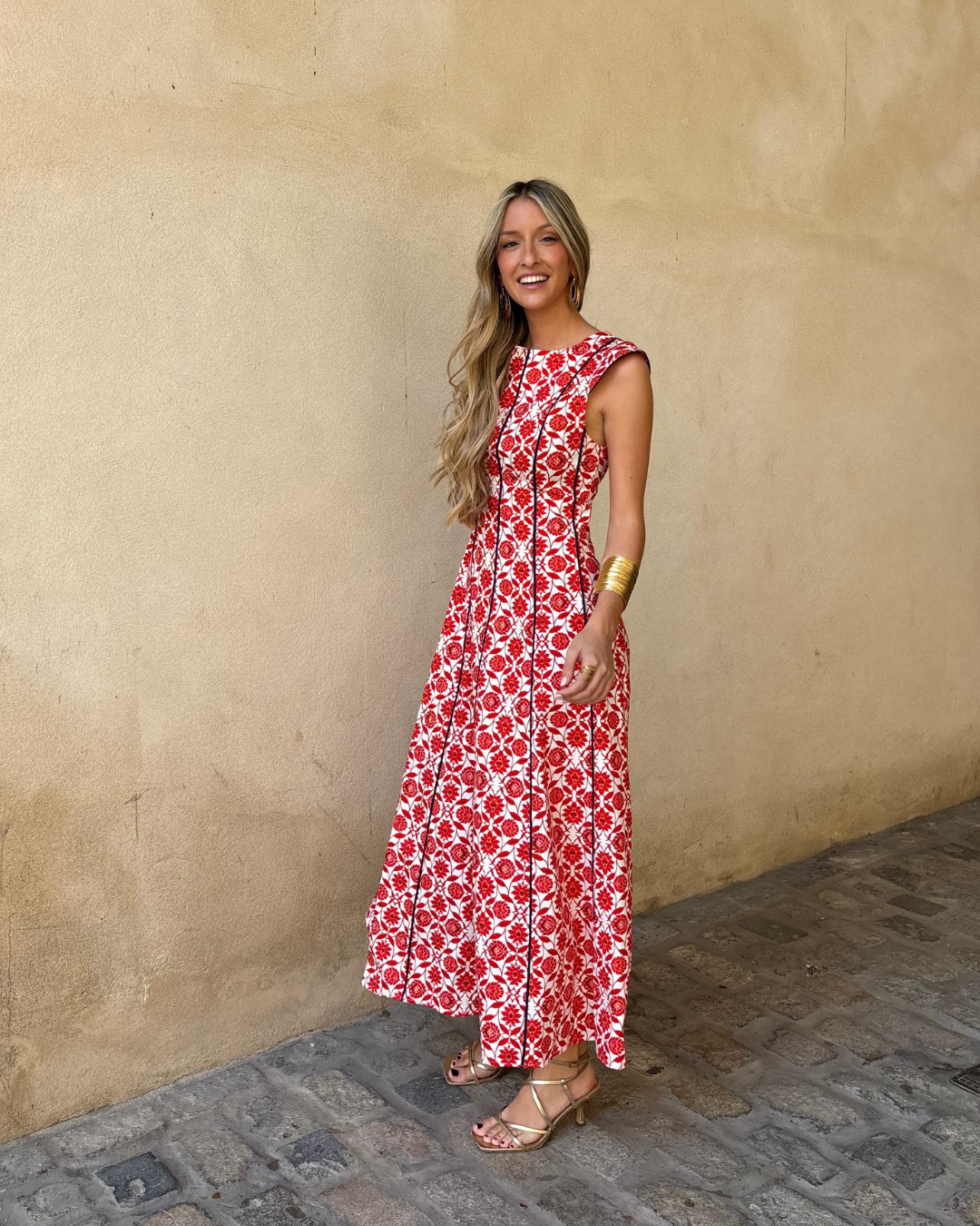 Vestido midi estampado con escote redondo y tirantes. Patrón evasé desde la cintura. Cierre de cremallera no visible en la parte trasera.