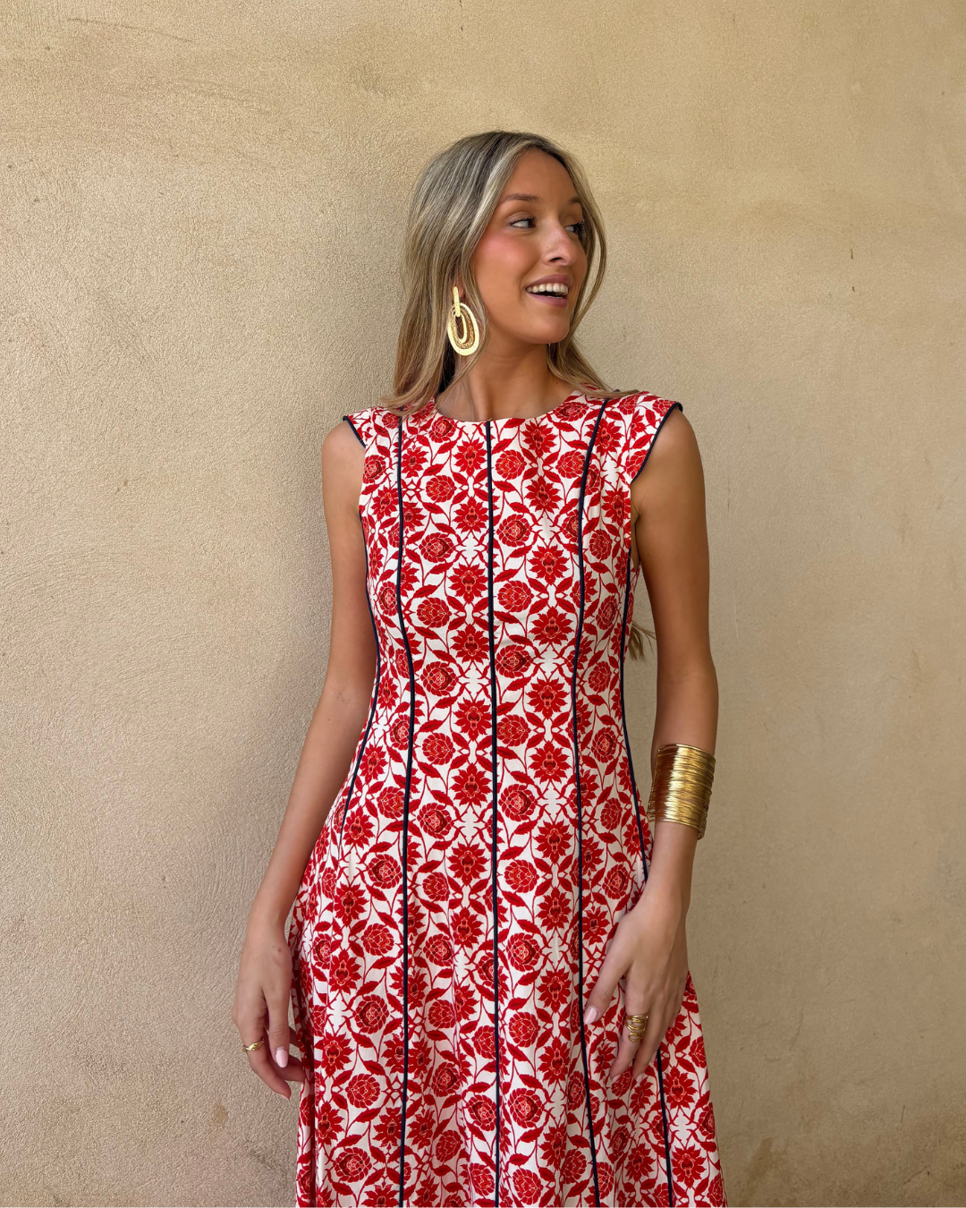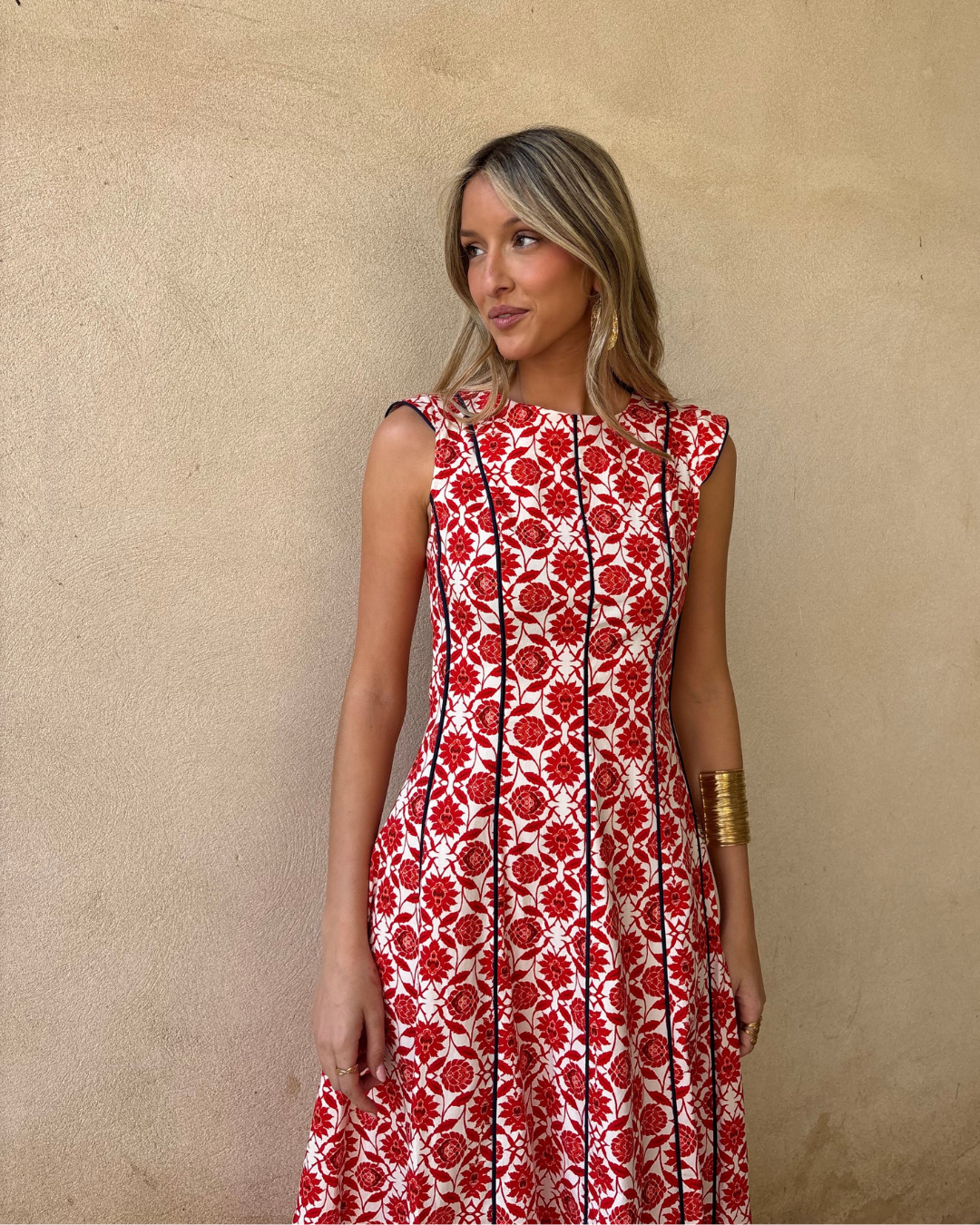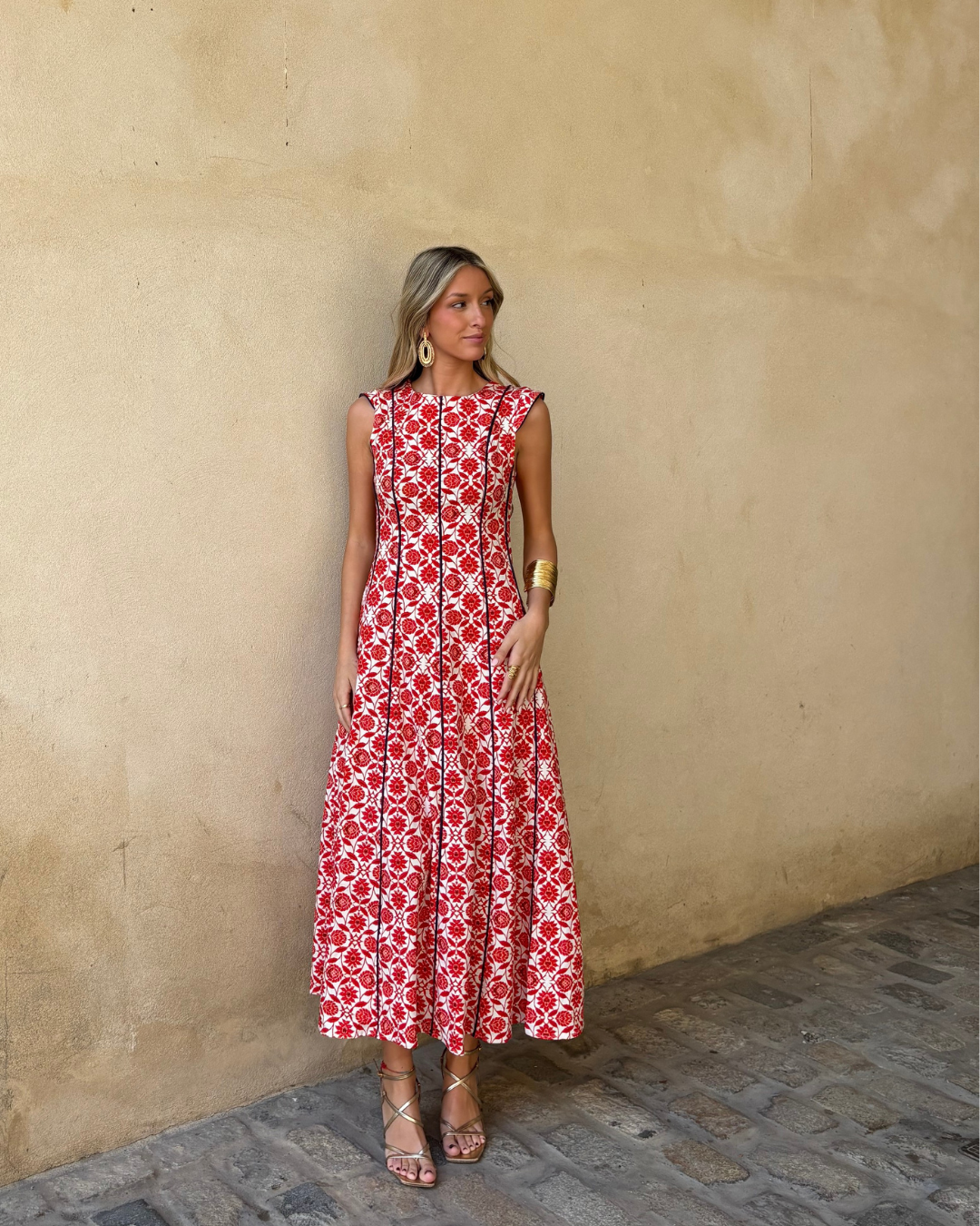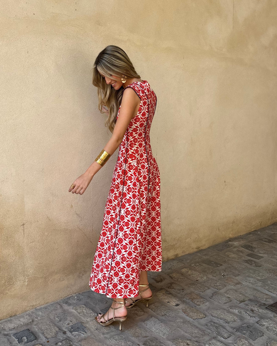 Vestido midi estampado con escote redondo y tirantes. Patrón evasé desde la cintura. Cierre de cremallera no visible en la parte trasera.